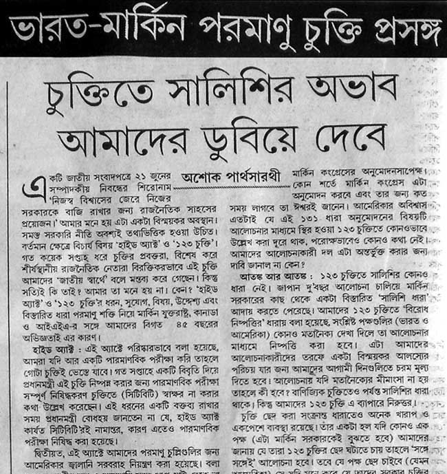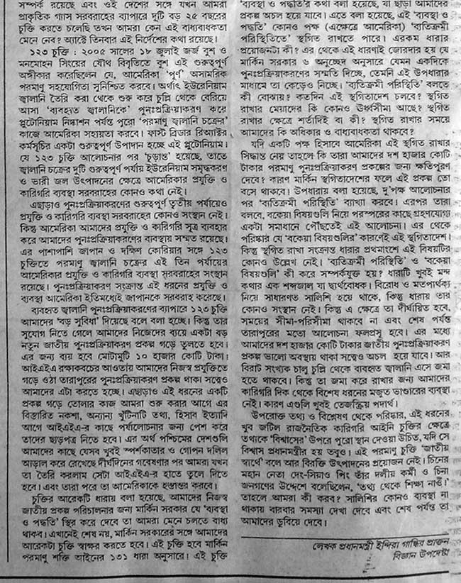 | www.milansagar.com This article in Bengali by Sri. Ashok Parthasarathi was published in the Bengali Daily "Dainik Statesman" from Kolkata on 18th July 2008. Here he discusses in details about Why it will be disastrous for India to go ahead with the Nuke Deal with USA. He was Scientific Advisor to Mrs. Indira Gandhi, the Prime Minister of India, under whose leadership India dared to go Nuclear by detonating India's first Atom Bomb at Pokhran on 18th May 1974, code named "Smiling Buddha". |