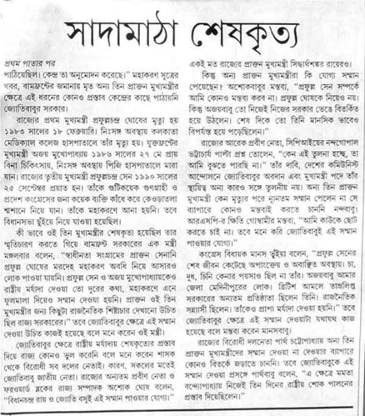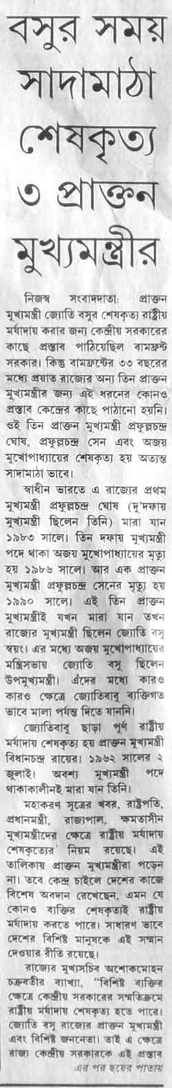 ইতিহাসের পাতায় জ্যোতি বসুর প্রকৃত মূল্যায়ন হবে এই আমাদের আশা | তাই আমরা, নানা পত্র পত্রিকায়, তাঁর সম্বন্ধে, তাঁর প্রয়াণ-কালে প্রকাশিত প্রবন্ধগুলি একত্র করার চেষ্টা করেছি | আপনি যদি এ ছাড়া আরও কোনো প্রকাশিত লেখা এখানে তুলতে চান তাহলে তা স্ক্যান করে, আমাদের এই ঠিকানায় srimilansengupta@yahoo.co.in ইমেল করে পাঠিয়ে দিন | আমরা সেই পাতায় প্রেরকের নাম-ঠিকানা উল্লেখ করবো |