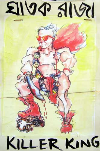 | Why this Art ? After the Elections in May 2006, the Suddenly-Capitalist-turned-Communist (CPIM) led Govt. of West Bengal under chief minister Mr Buddhadeb Bhattacharya, started acquiring prime agricultural land for multinationals like Tata (the same Tata of the famous CPIM slogan "Tata Birla nipat jao" or "Down with Tata Birla" in Bengali !), Salem (who had helped Gen. Suharto in the process of termination of communists in Indonesia), DOW Chemicals (Notorious maker and supplier of Agent Orange and Napalm used in Vietnam war) etc. This led to a "Save the Agricultural Land movement" or "Krishi Jomi Bachao Andolan" starting from Singur. But the WB govt forcibly acquired the land (about 1000 acres) for their new friend Tata, in Singur beating up villagers mercilessly resulting in 1 death(Rajkumar Bhul) and later rape and burning of Tapasi Malik, a young activist. (being investigated by CBI). That was not enough. They issued a notice for acquiring a much larger chunk of land (about 40000 acres) for setting up a Chemical Hub by DOW Chemicals. The villagers of Nandigram formed "Anti Land Eviction Committee" or "Jomi Uchchhed Protirodh Committee" and stopped all entry of govt personnel entering Nandigram by cutting off all entry roads to the area. The govt, along with hired goons and party cadres of the main ruling party, dressed up as police, in a ploy to enter the village carried out a well planned Genocide killing 14 as per govt. figure and Hundreds by other sources. The free media was not allowed to enter the area, like in Singur, which caused a lot of embarrassment for the govt. This Genocide caused an uproar by the intellectuals in Kolkata and rest of the country. Poets protested through their poetry, which can be read on our pages of Singur Nandigram Poetry. Artists protested through their Art. Kolkata and other cities and towns of West Bengal witnessed protest marches on its streets such as never before. We have collected some of those Art and have placed them here for posterity. Art in Anguish (Just click on any picture to see enlarged view) |