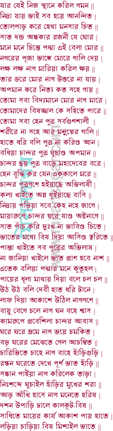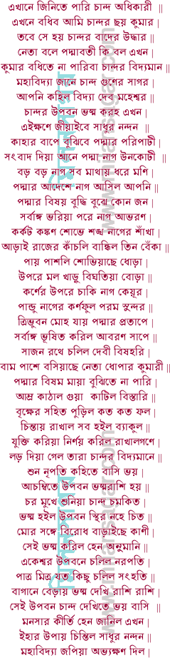 ( সাজিল যে বিষহরি পদ্মা শিবের কুমারী হরিতে চান্দর মহাজ্ঞান | মায়ারূপে বেশ ধরি সাক্ষাতে নটের নারী ইন্দ্র ব্রহ্মা বিধি মোহ যান || ) ললিত সুবর্ণ থোপা সুঠাম বান্ধিল খোপা গলায় হার বান্ধিল বাওল | কাজলে রঞ্জিত আঁখি কর্ণে সুবর্ণের চাকি নামা কর্ণে পরে কর্ণ ফুল || বিচিত্র বসন পরে সুবর্ণ কঙ্কণ করে হাতে শোভে সুবর্ণ কেয়ূর | কস্তুরী কুসুম গায় চলন্ত নূপুর পায় রুণু রুণু বাজিছে নূপুর || যে দেখিবে সেই তুষ্ট দুই নাগ হইল নট্ট কাধে করি লইল মৃদঙ্গ | অপযশে নাহি ব্যথা দাসীরূপে চলে নেতা আরো নাগ লইলেক সঙ্গ || সাধিতে বিষম কাজ মনসার নাহি লাজ দেবকন্যা হইলেন নটী | কানাকানি করে দেবে মনসা কি করে এবে চন্ডিকা হাসেন খটখটি || সাজিয়া আসি সকলে আকাশ পথেতে চলে অবশেষে হইল দিনভাগ | বায়ুগতি অনুসারে চলিল চান্দের দ্বারে পঞ্চস্বরে গাহে নানা রাগ || মৃদঙ্গ হানিয়া যায় মনসা মধুর গায় বসন্তে কোকিল গায় সারি | শুনিয়া মধুর গীত অস্থির চান্দর চিত বিজয় গুপ্ত রচিল লাচারি ||