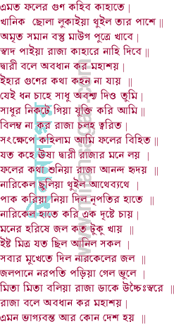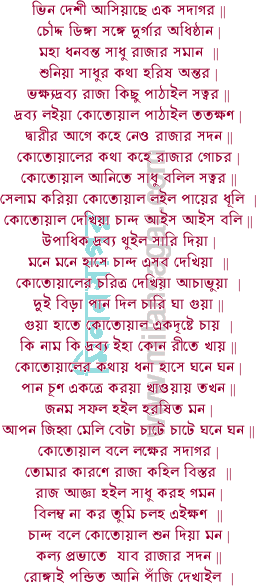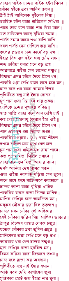 তোমার দেশেতে যাব এক লক্ষ টাকা লব পেট ভরি খাব নারিকেল | আমার পাপিষ্ঠ রাজ তাহাতে পড়ুক বাজ এদেশে না হয় হেন ফল || শুনিয়া রাজার কথা পুরোহিত ওঝা তথা বলে রাজা আমি যাব সঙ্গে | শুনিয়া দ্বিজের বাণী কোতোয়াল বলে পুনি রাজা সঙ্গে আমি যাব রঙ্গে || ধন্য করে শিব পূজা ধন্য তুমি দেশের রাজা যে দেশে উপজে নারিকেল | সাধু বাণিজ্যে আইল বড় ভাগ্যে মিতা পাইল বিধি মোরে মিলাইল সকল || বলে পুরোহিত ওঝা একেলা কি যাবা রাজা তুমি যাইতে সাথে যাব আমি | শুনিয়া ব্রাহ্মণের বাণী পাত্র মিত্র কানাকানি দাস হইয়া সঙ্গে যাব আমি || রাজার অভিলাষে খল খলি চান্দ হাসে ভিন্ন দেশে যাবা রাজা হইয়া | যত নারিকেল নাও বত্সরে খাইলে না ফুরাও ধন দিয়া তুল বদলাইয়া || রাজা বলে শুন মিতা কহিছ উচিত কথা আমি নহে ধনেতে কাতর ||