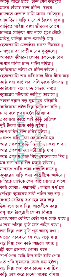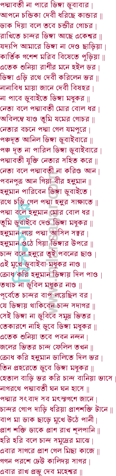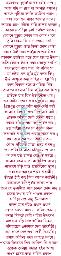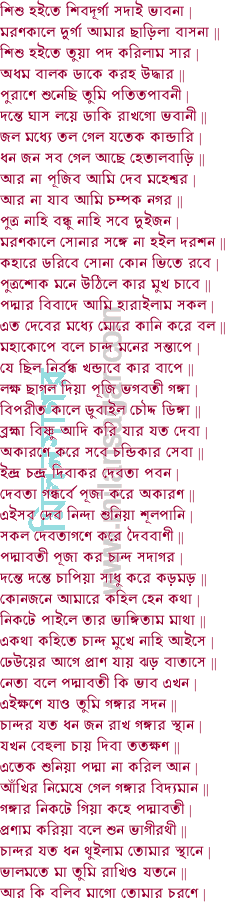 ১ নাগরথে চড়িয়া চলিল বিষহরি | তাড়াতাড়ি ধাইয়া গেল গঙ্গাদেবীর পুরী || প্রণাম করিয়া বলে তুমি আমার মাতা | মন দিয়া শুন কহি মোর দুঃখের কথা || জাতি হীন চান্দ বেটা নগরের ছার | তাহাতে হইল মোর কুলের খাঁখার || লুকাইয়া পূজে সোনা ভাবিয়া সঙ্কট | বার্তা পাইয়া বাম পায় ভাঙ্গে মোর ঘট || ঝির অপমান তুমি দেখিবা কেমনে | সকল নিবেদিলাম মাতা তোমার চরণে || মোর মনে লয় মাতা যদি তুমি আজ্ঞা দেও |