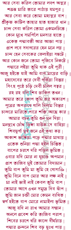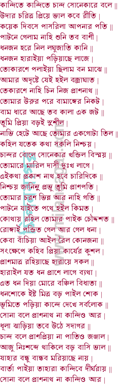 গগন ঢাকিল মেঘে পবন চলিল বেগে দেখিতে নারিলাম বাপ ভাই || স্বপন দেখিলাম রাতি এক কন্যা নাগজাতি সর্পে বেষ্টিত সর্ব গাও | অন্তরীক্ষে থাকিয়া চলে ধরিয়া তোমার চুলে সমুদ্রে ডুবাইল চৌদ্দ নাও || মিছা সে গৌরব কর মেঘের গতিক বড় নিশ্চয় মজিব জল মধ্যে | বরিষে মুষল ধার ডিঙ্গা হইল ভার আজু প্রাণ রহে পুণ্যফলে || সমুদ্রে কাতর মন চিত্ত হরি নারায়ণ প্রভু মোরে সঙ্কটে রক্ষা কর | পদ্মাবতী দরশনে সানন্দে বিজয় ভণে যাহারে সদয় দুর্গা মা ||