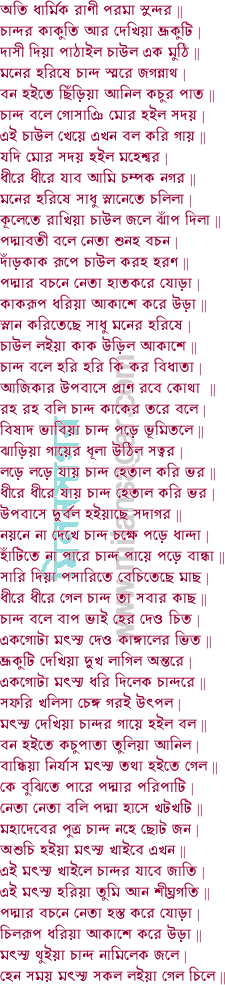কান্ডার ধরিও দড় তরঙ্গ হইল বড় পাতা হালে নাহি ছোয় পানি | যেন কুমারের চাক চৌদ্দ ডিঙ্গা লইল পাক ঝলকে ঝলকে উঠে পানি || ভাঙ্গিল নৌকার গলই ছিঁড়িল পাটের সরই বিবাদে লাগিল মোরে কানি ভয়েতে কাঁপিছে তনু রাখিবারে না পারিনু মজিলেক ডিঙ্গা চৌদ্দ খানি || বলে রোঙ্গাই ব্রাহ্মণ পদ্মারে কর পূজন রক্ষা হবে সকল তোমার | পদ্মারে পূজহ ফুলে তবে সে যাইবা কূলে নহে প্রাণ না বাঁচিব আর || শুনি সাধুর হইল দুঃখ কি বলিলা আরে মূর্খ আমার তরে না চিন্তিল হিত | তুমি আমার ব্রাহ্মণ না বুঝি আমার মন ভাল বোঝে সোমাই পন্ডিত || ফিরিয়া দেশেতে যাই বুঝিব তোর বড়াই দ্বারেতে আসিতে করব মানা | শুন তের নফর মোরে বলে দুরক্ষর মোরে উপহাস করে ধনা || চান্দোর কুমতি আর্ত না শোনে পরের যুকতি পদ্মারে দেয় নানা গালি | পদ্মাবতী দরশনে সানন্দে বিজয় ভনে চান্দোর ধন জন দিল ডালি ||