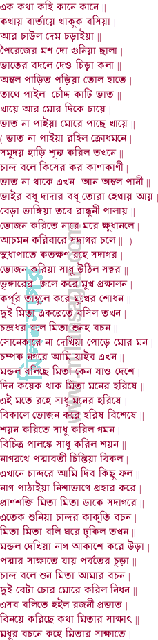 দক্ষিণ পাটনা দূর কনক নগর পুর তথা রত্ন রহে গড়াগড়ি | হীরা মন মাণিক্য ধন হেলা করে সর্বজন চট হরিদ্রায় বড় করি || তথায় নানা ধন পাইয়া দেশে চলিলাম ধাইয়া ত্বরিতে আসিলাম কালিদয় | হেনকালে বিধি লাগে আকাশ ঢাকিয়া মেঘে বিবাদে লাগিল মনসায় || ঝাপে ঝাপে বহে বাও আজরে না রহে নাও ধন জন হারাইলাম সকলে | কানি করিল বল ধন জন গেল তল প্রাণ রক্ষা পাইলাম পুণ্যফলে || মন্ডল কহিছে মিতা না কহিও দুঃখের কথা এত দুঃখ সহন না যায় | আজ নিশি অবশেষে যাইও আপন দেশে সানন্দে বিজয় গুপ্ত গায় ||