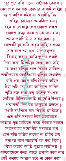 ১ যখন গেলা তুমি দক্ষিণ সহর | পঞ্চমাসের গর্ভ ছিল আমার উদর || গর্ভ লক্ষণ পত্র দিলেক আনিয়া | পত্র দেখিয়া কেন বিস্ময় কর হিয়া || সুস্থির হইয়া বস বাটার তাম্বুল খাও | শুভক্ষণ করিয়া পুত্রের মুখ চাও || সোনার বচনে সাধু হরষিত মন | লক্ষ্মীন্দ্রকে ধরি সাধু দিল আলিঙ্গন || লক্ষ লক্ষ চুম্ব দিল বদন কপালে |
