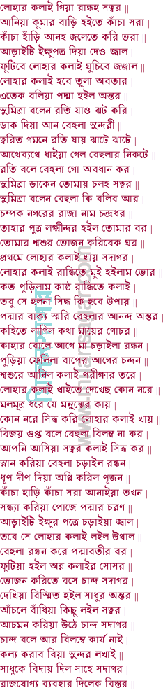 পূর্বদেশে আছে কন্যা করুণাময়ী নাম | সেই কন্যা দিয়া মম নাহি কোন কাম || সদাগর বলে ঠাকুর মশায় শুন দিয়া মন | বিদ্যা নামে কন্যার মম নাহি প্রয়োজন || ঈশান কোণে কন্যা আছে বেহুলা তার নাম | রূপবতী গুণবতী অতি অনুপম || উজানী নগরে আছে সাহে সদাগর তার নাম | সাহে সদাগরের কন্যা সে বেহুলা তার নাম || বেহুলা জীয়াইতে পারে ছয় মাসের মরা | রূপে বিদ্যাধরি তিনি মুনি মনোহরা ||