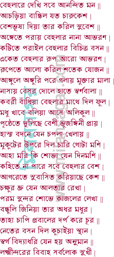 হইল গোধূলি বেলা সুসজ্জিত করে বেহুলা নানা বাদ্য বাজে সুললিত | হইলেক দরশন আনন্দিত নারীগণ হুলাহুলি দিল চারি ভিত || বেহুলার দেখি ছাঁদ আকাশে উঠিল চাঁদ