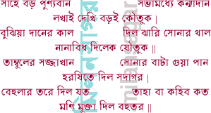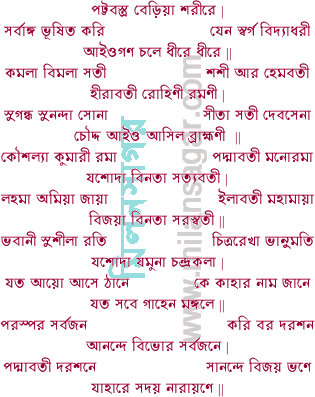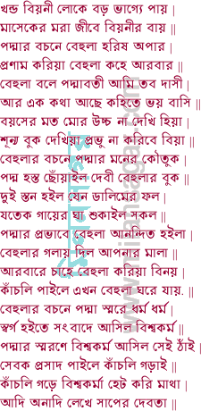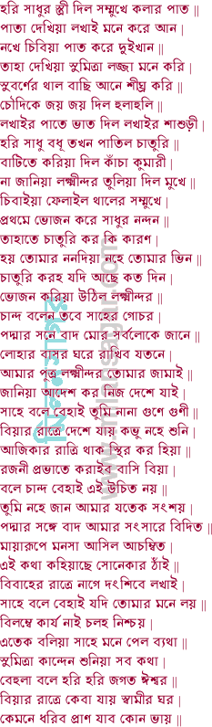 নানা বাদ্য মনোহর বিয়া করে লক্ষ্মীন্দর দেখিতে আসিল দেবগণ | আপন বাহনে চড়ি রহিল বিমান ভরি আনন্দে মগন সর্বজন || হংস পৃষ্ঠে ভর করি চতুর্মুখে বেদ পড়ি আপনে আসিল প্রজাপতি | শঙ্খ চক্র গদা হাতে গোবিন্দ গরুড় রথে দুই পাশে লক্ষ্মী সরস্বতী || বলদে শঙ্কর চলে নয়নে অনল ভালে