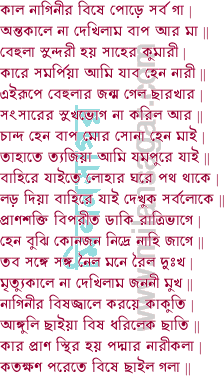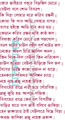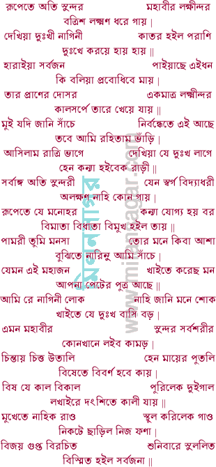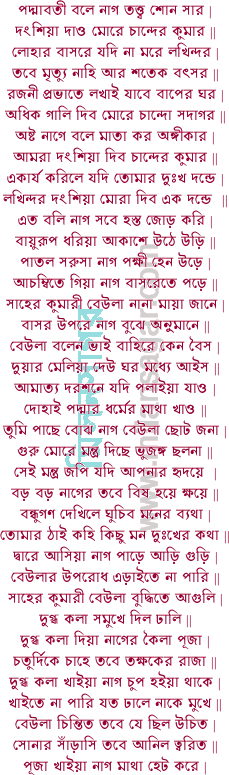আজু বিয়া হইল রাতি না চিনিলে নিজ পতি নাগিনী দংশিয়া গেল মোরে | যদি জানিতাম সাঁচে এতেক নির্বন্ধ আছে বিয়ার রাত্রে সাপে খাবে মোরে || এক দিবসের লাগি তোমার বধের ভাগী এই পাপে নরকে বিভোগ ||