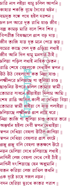 সোনার সাঁড়াসি দিয়া মাথা চাপি ধরে || কালিকার মন্ত্রে তবে বেউলায়ে জপয়ে | লড়িতে না পারে নাগে মোড়া মোড়ি যায়ে || সাহের কুমারী বেউলা বুদ্ধি নহে ঢিল | নাগবন্দী করিয়া ঘরে দিল খিল || অষ্ট নাগ বন্দী করি সাহের কুমারী | লখিন্দরের শিয়রে বসি জাগে একেশ্বরী || হেনকালে কাল ক্ষুধা লখাই জন্মিল | রন্ধন করিয়া দিতে বেউলারে কহিল || বিজয় গুপ্তে বলে গাইন হও সাবহিত | পয়ার এড়িয়া বল লাচারির গীত ||