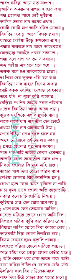( নাগ লয়ে উন কোটি বেড়িল হোসেন হাটি ডরে কাঁপে যতেক তুরুক | কাজির ঘর ভাঙ্গা ঝাপ তাহা দিয়া যায় সাপ বিবি পলায় পদ্মার কৌতুক || সর্প ভয়ে পড়ে মূত্র খাইল কাজির পুত্র ঢলিয়া পড়িল ততক্ষণ | দারুণ বিষের জ্বালে আঁখি ঘোরে তনু জ্বলে নাকে শ্বাস বহে ঘনে ঘন || ) কাজিপুত্র সাপে খাইল ওঝায় বাড়িতে আইল ওঝা বলে এর প্রাণ নাই | কালাতুরি নামে বান্দী সেই বলে শুন কাজি বিবিরে খাইল বিষম ঠাই || কেতাব কেরাণ ছাড় আপনি ফু দিয়া ঝাড় অন্য ওঝার দেখার যোগ্য নয় | কি কব কহিতে লাজ মাথায় পড়িল বাজ হেন স্থান দেখিবার নয় || ( হোসেনের মা বলে পুত কেন ক্ষেপাইলে ভুত শরীরে না সহে দুঃখ আর || নাগ ফেরে ঘরে ঘরে যারে খায় সেই মরে সেনহাটি হইল ছারখার || ) মরিল দুলাল বান্দী তার লাগি কান্দে কাজি মনে রহিল তার কথা | আর সব যত কান্দি তাহার মত যত বান্দী ইহার সম পাকানী নাহি হেতা || ফুটন্ত ধুতুরার ফুল যেন দেখি দন্তমুল মাথায় উকুন শতে শতে | কাজি কান্দে মনস্তাপে গোলাম খাইল সাপে বিবিরে প্রবোধ দিবে কে || বাড়িতে যাইতাম খুইয়া বিবির সঙ্গে থাকিত শুইয়া সারারাত্রি থাকিত উজাগার || ( বুড়া কাজির খাইল পোহ মনস্তাপে যায় মোহ হাসেন হোসেন চাহে দংশিবার || মায়ে পোয়ে কথা কয় তাহে প্রাণ স্থির নয় চৌদিকে বেড়িয়া উঠে সাপ | সাপ দেখি ভয়ঙ্কর হাসেন হোসেনের ডর ভয়ে পড়ে জলে দিয়া ঝাপ || দুই ভাই জলে ভাসে তাহা দেখি নাগ হাসে চেয়ে ছিলো নাগ ধরিবার | আপনার হিত চাও পূজহ পদ্মার পাও বিজয় গুপ্ত রচিল পয়ার ||