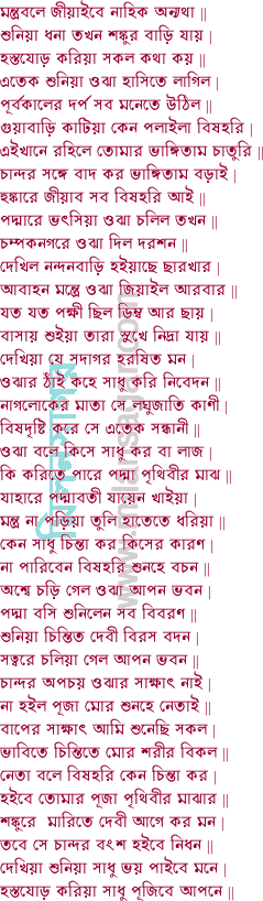 শিশুকালে দিল বিধি পাইনু অমূল্য নিধি তাহা সাধু ভাঙ্গিয়া ফেলিল | হেন দেবী বিষহরি নিরবধি সেবা করি ছয় পুত্র তাহাতে হইল || দারুণ সাধু ভাঙ্গে তারে আর না রহিব ঘরে পদ্মার উদ্দেশ্যে যাব বনে | কান্দি বিষাদিত মন যাউক বাড়ি ধন জন প্রাণ দিব পদ্মার চরণে || মনসা হইল বৈরী আমি যেন আগে মরি ধন ও পুত্র থাকুক কুশলে | পদ্মাবতীর দরশনে সানন্দে বিজয় ভণে সবাকারে রাখ মা মঙ্গলে ||