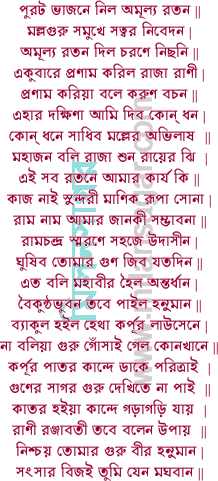 | যেই সব সরণ শিখিলে দশ দিনে | সেই সব অভ্যাস করিবে এক মনে || এত বলি রঞ্জাবতী বাড়িকে বিদায় | দুভাই আখড়া খেলে ঘুরে পায় পায় || ষোল গন্ডা চলনি বলনি বিশাশয় | উলটি ফলঙ্গ দেই অঙ্ক মাঝে রয় || দিনে দিনে দুভাই সাজিল মল্লবেশ | বলরাম কর্পূর লাউসেন হৃষীকেশ || দিবস-রজনী যুদ্ধ বাড়ে বিপরীত | মল্লযুদ্ধ করে নিত্য মল্লের সহিত || মল্লের চরণ ধরি তুলিয়া কাছাড়ে | অঙ্গে ঠেলে পর্বত পাথর গাছ পাড়ে || ফলঙ্গ সারিতে পায় চঞ্চল অবনী | দেবতা অসুর কাঁপে দেখিয়া চলনি || নিবড়িল বরিষা শরত উপাদান | দেবীপূজা আইল পড়ে কালিকা পুরাণ || অবনীমন্ডলে নাই আনন্দের সীমা | তেহ ঘট আনে কেহ আন্যাছে প্রতিমা || কার ঘরে নাটো নাচে কার ঘরে গীত | কেহ দান ধ্যান করে দুর্গার পিরিত || ঘরে ঘরে দ্বিজবর পড়ে সপ্তশতী | কেহ যজ্ঞ দান করে হয়্যা শুদ্ধমতি || জরা আদি বালকে করে বেশ | পরিধান পরিপাটি বরণ বিশেষ || দেবাসুর মানুষ মানুষী গীত গায় | প্রতি ঘরে নট নটী নাচিয়া বেড়ায় || আশ্বিনে আনন্দ বড় সভাকার ঘরে | দশভূজা দশদিগে বড় শোভা করে || মহা মহা পূজা করে কত ভাগ্যবান | ছাগ মেষ মহিষ সহস্র বলিদান || ক্ষীর খন্ড ছানা পানা পরিপূর্ণ গাড়ু | পিষ্টক পায়স চিনি সুধাময় নাড়ু || বাটা ভরা কাটা গুয়া বিড়া বান্ধা পান | পট্টবস্ত্র অমূল্য রতন বিদ্যমান || এইরূপে সংসারে ভবানী-পূজা করে | ঈশ্বরী বসিয়া তথা কৈলাশ-শিখরে || শিবের সহিত পাশা খেলেন কৌতুকে | পদ্মাবতী বলে কিছু দুর্গার সমুখে || সদাই বলিব কিছু অভয়চরণে | আশ্বিন মাসের পূজা নাই পারা মনে || যতী সতী তোমারে কব়্যাছে এক ধ্যান | পূজা নিতে চল মাতা অবনী পয়ান || এত শুনি ধরে দেবী শিবের চরণ | দ্বিজ রূপরাম গান সখা নিরঞ্জন || ঈশ্বরী বলেন শুন ওহে প্রাণনাথ | নিবেদন করি কিছু তোমার সাক্ষাত || সত্বরে বিদায় হব নায়রের ঘর | এখন বিদায় লব তোমার গোচর || কৈলাশ পর্বতে নাই এ পাট পড়শী | বলিতে দুঃখের কথা একদন্ড বসি || আশ্বিনে আমার পূজা করে সর্বজন | দেখিবারে যাব ভক্ত সবাকার মন || শঙ্কর বলেন গৌরী শুন মন দিয়া | নিরবধি ঘরে থাকি তোমা মুখ চ্যায়া || তুমি যদি ক্ষিতি যাবে পূজা দেখিবারে | জয়মঙ্গল অস্ত্রখান রাখ্যা যাহ ঘরে || এত শুনি ঈশ্বরী বিশেষ কম্পমান | বিজয় করিল দেবী সুবর্ণ বিমান || পূজা দেখিবারে দুর্গা করিল গমন | সদা সুখী দেখিল আনন্দ ত্রিভুবন || উরমাল ঘাঘর ঘন্টা রথের বাজনা | ইন্দ্র বলে পূর্ণ হৈল মনের বাসনা || দেখিতে দেখিতে রথ উঠিল আকাশ | রথের কিরণে তিন লোকের প্রকাশ || আনন্দে ঈশ্বরী-পূজা করে সর্বলোক | পাসরিল মরমে দারুণ পুত্রশোক || সভা আগে ব্রহ্মার মন্দির দরশন | পূজা দিল অভিলাষে অভয়চরণ || তবে পাইল বিষ্ণুর মন্দির শীঘ্রগতি | আপনি পূজিল বিষ্ণু কমলা সংহতি || ষোল উপাচারে পূজা দিলা নারায়ণ | নারদ-মন্দিরে দূর্গা দিল দরশন || কৃষ্ণকথা রাখিয়া নারদ মহামুনি | আশ্বিনে অম্বিকা-পূজা করেন আপনি || নারদ বলে