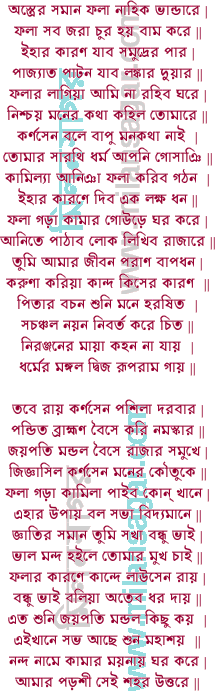 | গুণবন্ত কামিলা গুণের নাই সীমা | সদাই নির্মাণ করে সুবর্ণ প্রতিমা || সেই গড়্যা দিব ফল্যা ইথে নাঞি আন | তবে দেহ আপনি আরতি গুয়া পান || আজ্ঞা দিল শিঙ্গাদারে এই বাক্য শুনি | সত্বরে কামিল্যা ডাকি আনহ এখনি || রাজার বচন শুনি চলিল সত্বরে | শীঘ্রগতি উত্তরিল কামিল্যার ঘরে || নিরবধি কামিল্যা গঠনে বস্যা আছে | সম্ভাষ করিয়া শিঙ্গা বলে তার কাছে || চল ভাই দরবার বিলম্ব নাহি সয় | না জানি ডাকিল কেন রাজা মহাশয় || কামিল্যা গঠন রাখ্যা করিল গমন | দরবার ভিতর গিয়া দিল দরশন || আইস আইস কর্ণসেন বলেন আপনি | তুমি বড় গুণিন পরের মুখে শুনি || এবার কৃতার্থ হবে শুনরে কামিলা | সত্বরে গড়িয়া দেহ লাউসেনের ফলা || এক লক্ষ টাকা দিব এহার দক্ষিণা | দুহাথে তোড়র দিব দুই কানে সোনা || প্রথম বক্ শিস দিল পামরি বসন | পুরস্কার মাল্য পাইল অপূর্ব চন্দন || তিন বার কামিল্যা করিল অঙ্গীকার | দরবার ভিতর তারে দিল পুরস্কার || দশ দিনে ফলা দিব অঙ্গীকার করে | কামিল্যা বিদায় হয়্যা গেল তার ঘরে || স্নান পূজা সকল সারিল নিজালয় | ফলার কাষ্ঠের হেতু করিল বিজয় || বাম হাথে নিল বাস পাখুরি বাটালি | পথে যাত্যে স্মরণ করিল ভদ্রকালী || ময়নার দক্ষিণে আছে সিঞ্জিনীর বন | কর্মকার গেল তথা কাষ্ঠের কারণ || ছয় ঋতু একু ঠাঁই দেখিল কাননে | কোকিল উগারে মধু ময়মত্ত গানে || ভ্রমরা ভ্রমরী ফুলে করে মধুপান | মনোজ মাতাল হয়্যা হরিগুণ গান || বনশোভা কামিনী সাক্ষাত বৃন্দাবন | জানে সভ কামিল্যা পন্ডিত বিচক্ষণ || ফুলে ফলে পরিপূর্ণ সুনির্মাণ ডাল | সত্যসার সমুখে দেখিল পিয়াশাল || ঐমনি তাহার মূলে হানিল কুঠার | ভূত প্রেত পিশাচ এ গাছে অবতার || নতুবা এ গাছে বস্যা কেবা কথা কয় | অরণ্যে দেবতা পারা কব়্যাছে আশ্রয় || কুঠার কুড়ালি আগুলিল বাস করে | পুনরপি চোট হানে বকুল উপরে || আথালি-পাথালি বাস হানে তার মূলে | রাম কৃষ্ণ গোপাল গোবিন্দ বৃক্ষ বলে || হতমূর্খ কামিলা ---- বকুল বৃক্ষ কয় | আমি কি ফলার যোগ্য তোর মনে লয় || দিন কত সয়ালে হরির গুণ গাই | তুমি কেন হিংসা কর কর্মকার ভাই || বকুল বৃক্ষের বাণী শুনিল কামিলা | দরশন দিল তবে আশদের তলা || বাস হাথে ঐমনি হানিল চোট সাত | বৃক্ষ বলে মাথায় পড়িল বজ্রাঘাত || গোপাল গোবিন্দ রাম বলে উচ্চস্বরে | কোথাকার পাতকী আমারে হিংসা করে || শুনরে কামিলা ভাই হতমূর্খ তুমি | ফলার গঠন হেতু কাষ্ঠ নই আমি || বর্ণমধ্যে ব্রাহ্মণ এমন শ্রেষ্ঠ গুরু | চারিযুগ কাননে আশদ কল্পতরু || বৈশাখে আমার মূলে যেবা দেই জল | দেবসভা সমুখে বসিতে প্রায় স্থল || অন্য কাজে যেজন আমার ভাঙ্গে ডাল | নরকে চুবানি তায় দেই যম কাল || পত্র হিংসা করিলে পাপের নাই সীমা | মকরে অগস্ত্য মুনি লিখিল মহিমা || বনে কান্দে কামিল্যা বৃক্ষের কথা শুনি | তিনবার দন্ডবত করিল ঐমনি|| এইরূপ বনে বনে করিল ভ্রমণ | মনকথা হেতু তথা করিল শয়ন || দক্ষিণ অনল হেতু সুখে নিদ্রা যায় | হেনবেলা 
