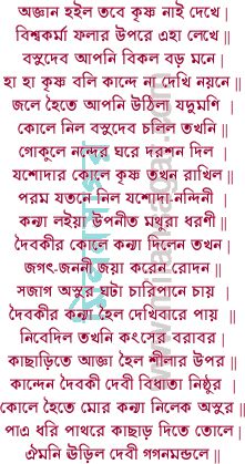 | গগনে ঊড়িয়া দেবী হইল অষ্টভুজা | বিধি বিষ্ণু বরুণ পবন দিল পূজা || আকাশ বাণীতে দেবী ডাক দিয়া কয় | নিকট মরণ তোর কংস দুরাশয় || জন্মিল তোমার শত্রু গোকুল নগরে | রূপরাম গীত গান বাঁকুড়ার বরে || একমনে শুন সভে ধর্ম ইতিহাস | দুমন করিলে হয় ধনপুত্রনাশ || সমুখে রাখিল বিশাই ভারথ পুরাণ | লাউসেনের ফলা লিখে হয়্যা সাবধান || চিত্র লিখে চতুরে চঞ্চল নয় মতি | আশে পাশে লতা পাতা নানা বর্ণ গতি || ভাগবত সমুখে সঘনে নিরক্ষণ | পুতনা রাক্ষসী বধ লিখিছে তখন || কংসের আদেশ পাইয়া পুতনা রাক্ষসী | ব্রহ্মার মোহিনী হল্য বিচিত্র ঊর্বশী || বিষ দিল পয়োধরে পূর্ণ পরিপাটি | পায়ে সাজে পাশুলী সুবর্ণ তুলাঙ্গটি || খোঁপায় চাঁপার মালা কিবা নাগেশ্বর | কৃষ্ণকে খুঁজিয়া কুলে গোকুল নগর || ঘরে ঘরে খুঁজিল না দেখে নারায়ণ | নন্দের মন্দিরে গিয়া দিল দরশন || কৃষ্ণ কোলে যশোদা রুহিণী তার কাছে | হেনকালে পুতনা বসিল গিয়া পাছে || যশোদার কোলে কৃষ্ণ দেখিবারে পায় | দেখি দেখি বলি আগে আগু হয়্যা যায় || দেখি দেখি বলি তবে কৃষ্ণ নিল কোলে | বিষ পয়োধর দিল বদনকমলে || বিষস্তন নারায়ণ জুড়িল চুমুক | পুতনা রাক্ষসী মৈল বিদরিয়া বুক || লিখিতে লিখিতে বিশাই কান্দে প্রেমজালে | শালঘরে বস্যা একা হরিবোল বলে || কান্দিতে কান্দিতে বিশাই ভাগবত দেখে | ফলার দক্ষিণদিগে দানখন্ড লেখে || সারি সারি গোপিনী মথুরা দিকে যায় | কদম্বতলায় কৃষ্ণ ডাকিয়া রহায় || সভা আগে রাধিকে সুন্দরি দেহ দান | ভাঙ্গা নায়ে পার হবে যমুনার বান || এখানে পসরা রাখ কদম্বের তলে | পদ্মপাণি পয়োধরে পরিপূর্ণ বলে || এত বলি পসরা নাম্বায় যদুমণি | ভান্ড ভাঙ্গি দধি খায় নাঞি শুনি বাণী || দেখ দেখ বলিয়া বদনে হরি ঢালে | আগু হইয়া বড়াই বুড়ি বলে হেনকালে || দধি দুগ্ধ খাইলে আজি অপমান দিব | বাঁশি বাঁধা দিব তোর মুরলী বেচিব || দানছলে তরুতলে রাধা আর কানু | হেনকালে বড়াই বুড়ি কাড়্যা নিল বেণু || তবে লিখে বিশাই মহিমা রঙ্গলীলা | হিঙ্গুল হর্তাল জৌ যাবক মহলা || হেঁটমুখ ফলা লিখে ফিব়্যা নাঞি চায় | রাধা কানু একত্রে বসিল ভাঙ্গা নায় || তরঙ্গ গভীর বড় যমুনার জল | রাধাকানু সহিত তরণী টলবল || কানাই বলেন আমি সুজন কান্ডারী | ভাঙ্গা নৌকা ডুবিবে তোমাকে দেখি ভারি || বানে পাছে ভাস্যা যায় দধি দুগ্ধ ঘি | আগু হয়্যা বৈস রাধে গুয়ালার ঝি || বিকল হয়্যাছে বড় দেখি বিপরীত | নতুবা ভাসিব রাধা তোমার সহিত || মায়াজাল তরণী তরঙ্গ আর বান | রাধার সহিত কৃষ্ণ আনন্দে খেলান || অপরঞ্চ বিশাই লিখিছে বৃন্দাবন | লতাপাতা চিত্র লিখে নানা বৃক্ষগণ || বৃন্দাবনে বিকশিত লিখে নানা ফুল | মল্লিকা কদম্ব চাঁপা কাঞ্চন বকুল || নাগেশ্বরী আম জাম কদলা কাঁঠাল | ফলে ফুলে বিকশিত লম্বমান ডাল || কোকিল উগারে মধু অলি গীত গায় | কৃষ্ণকোলে করি গোপী নাচিয়া বেড়ায় || বীণা বাজে মৃদঙ্গ মন্দিরা করতাল | নিধুবনে নৃত্যক