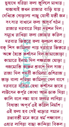 | কালি হৈতে অন্নজল না খায় তাম্বুল | অম্বিকার অস্ত্র পায়্যা হয়্যাছে আকুল || কোথা গেলে কর্পূর লাউসেন দেখা দেও | খড়োর সমান বাপু ফলা আস্যা লেও || এত শুনি লাউসেন ধাইল উভরড়ে | ফলা দেখি দুইভাই মাএর পায় পড়ে || পাএ ধব়্যা বলে তুমি বেণুরায়ের ঝি | তুমি যার জননী তাহার দুঃখ কি || এত বলি ফলা নিল ধর্মের গাজনে | সাধিল অনাদ্য পূজা পরিতোষ মনে || সুরঙ্গ প্রবালে শীঘ্র করিল সাজন | উরমাল ঘাঘর ঘন্টা বাজে বিলক্ষণ || জবা পুষ্প পরিপাটি যাবক সিন্দুর | চাহিতে না পারে কেহ পড়িছে চিকুর || সিন্দুরে মাজিয়া ফলা করে ঝলমল | উপরে সাজিল তার চামর গঙ্গাজল || শুভক্ষণে লাউসেন ধরিল ফলা খাঁড়া | ফলা ধরি ফলঙ্গ জুড়িল ফলাপাড়া || ফিরিয়া ফলঙ্গ দেই ফলা বামহাথে | খড়্গ ধরি লম্ফ দিল পতঙ্গের রথে || হুহুঙ্কার শব্দ শুধু ঘন ঘোর ছটা | স্বর্গে হৈল সচঞ্চল দেবতার ঘটা || তরণি পালায় ডরে বরুণ বিকল | পাতালে বাসুকি কাঁপে অষ্ট কুলাচল || শূন্যে শুধু সঘনে ফলঙ্গ দিয়া বোলে | একু ঠাঁই যম ইন্দ্র মাথা নাঞি তোলে || বিপর্যয় হয়্যাছে ধর্মের অবতার | লাউসেন দেখি যম করে নমস্কার || চতুর্মুখ বিধাতা দেখিলে জোড়হাথ | বিক্রম বিশাল শব্দ খড়্গ অচিরাত || বামহাতে সদাই ফলার ঝলমলি | নৌতন জলদে যেন পড়িছে বিজলি || অলক্ষিতে লাউসেন খেলে দন্ড ছয় | শ্রমজালে ভাসিয়া কর্পূর কিছু কয় || সিংহ হৈতে দ্বিগুণ তোমার দেখি বল | রাজাকে ভেটিতে ত্বরা গৌড়রাজ্য চল || দুভাই গৌড়ে হবে রাজার চাকর | ইনাম লিখিয়া নিব ময়নানগর || বত্সর বত্সর কত দিব ইরশাল | সেই ধনে দেশে দিব দেউল জাঙ্গাল || নিকট গৌউড় বটে দূর নাহি পথ | যেইদিগে জাহ্নবী আনিল ভগীরথ || আপনি বটেন মেস্বা রাজা গৌড়েশ্বর | মহাপাত্র মাতুল ব্রহ্মাকে নাঞি ডর || গোউড় করিলে যাত্রা তবে ভাল হয় | জাহির করিব গুণ নাম আর যশ || বক্ শিস পাইব ঘোড়া সবাকে সুরস | মহীচন্দ্র ভূপতি মান্ধাতা আদি ছিল || একে একে নিজ গুণ জাহির করিল | ঘরে বস্যা থাকিলে সম্পদ নাঞি পাই || এই দন্ডে দুইভাই গোউড় চল যাই | বিনয়ে বিদায় হব জননীর পায় || এত শুনি যাত্রা করে ময়নার রায় | গণিয়া বান্ধিল বীর বত্তিশ হেত্যার || পিতার চরণে গিয়া করে নমস্কার | তুমি আজ্ঞা দিল যাই গৌড়ভুবন || এক দন্ড না সহে কথার বিলম্বন | নিকট গোউড় রাজ্য দূর নহে পথ | যেই দিগে জাহ্নবী আন্যাছে ভগীরথ || দুই ভাই হব গিয়া রাজার চাকর | ইনাম লিখিয়া নিব ময়না নগর || ঘোড়া পাব বক্ শিস জাহির হব গুণ | দরবারে বাড়িবে তবে মহিমা দ্বিগুণ || মামা মেস্বা ভেটিব অনেক সাধ মনে | মামীকে দেখিয়া যাব রমতির গনে || মাসীকে দেখিতে মনে বড় সাধ যায় | তার পাকে বিদায় তোমার দুই পায় || শুভক্ষণে ভূপতি ভেটিব সবিনয় | দরবারে বসিয়া আমি দিব পরিচয় || স্বয়ং আমার মেস্বা গোউড় রাজন | মাতুল প্রধান পাত্র বিদিত ভুবন || তবে যদি পর্বত উড়িয়া পরে গায় | ঐমনি উড়ায়্যা দিব কত বড় দায় || সিংহ যদ