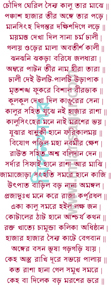 | পড়িল কোটাল রণে অবশেষ নাই | কন্ধে মুন্ডে রুধিরে ভাসিল কত ঠাঁই || কালুর বিক্রম দেখি পালায় কোটাল | সিংহের সমীপে যেন সারঙ্গ শৃগাল || কাঙুরের কোটাল সমরে দিল ভঙ্গ | দ্বিজ রূপরাম গান বিধাতার রঙ্গ || সমর জিনিল বীর কালু ধনুর্ধর | কোটাল পালায়্যা গেল কাঙুর ভিতর || নিজ সেনা সমরে পড়িল সর্বজন | ধাইল পবন বেগে বিপাক গহন || সভা করি কাঙুরে বস্যাছে কর্পূরধল | কোটাল কান্দিয়া বলে তরাসে বিকল || রক্ষা নাহি কাঙুরে অনর্থ বড় হৈল | কালুসিংহের সমরে অনেক সেনা মৈল || আচম্বিতে হানা দিল নাঞি বোলচাল | মঘবান ঐরি যেন বিক্রম বিশাল || পড়িল সকল ঢালী বন্দুকী ধানুকী | অপরঞ্চ জিবার বাসনা নাঞি দেখি || দিগম্বর মনে করে তেজিব কাঙুর | কালরূপে দেখা দিল কেমন অসুর || একেশ্বর দেখিলু দোসর কেহ নাই | কুঞ্জর সমুখে যেন সিংহের বড়াই || দুই দন্ডে কাটিল সকল দলবল | পার হয়্যা আসিয়াছে গন্ডকীর জল || এত শুনি কর্পূরধল কোপে কম্পমান | বদন শসীর বর্ণ অরূণ নয়ান || সাজ সাজ আপনি বলিছে ঘনে ঘন | দুরদুর দামা বাজে গোলার নিঃস্বন || ডিগি ডিগি শবদে কাড়ায় দিল কাঠি | টলবল করে রাজা কাঙুরের মাটি || আপনি কর্পূরধল সাজ সাজ ডাকে | সভাই হেত্যার বান্ধে কেহ নাই থাকে || চৌদিগে সত্বর সাজে রাজার দলবল | সৈয়দ কোমর বান্ধে পাঠান মোগল || কাল ভেরিকাল বাজে দগড় দাদুড় | পঞ্চপাত্র আগে সাজে চঞ্চল কাঙুর || কেহ-বা ঘোড়ার পিঠে কেহ-বা কুঞ্জরে | ইন্দ্র আদি দেবতা কাঁপিল সব ডরে || রাজার ভাগিনা সাজে মানসিংহ রায় | পঞ্চাশ হাজার ঘোড়া আগু পাছু ধায় || নানাবর্ণ সিফাই যুবক আর জরা | সুবর্ণ পাগড়ি শিরে সলম্বিত ডোরা || দুহাথে হেত্যার ধরে আর বাগডোর | সৈন্ধব পাথর পারা সিংহ হৈতে জোর || বীর কালু বলিয়া তর্জন করে রাণা | হেত্যার বান্ধিয়া উঠে রণে দিতে হানা || কত ঠাঞি শিঙ্গা পড়ে কত ঠাঞি কাড়া | কত ঠাঞি সাজন করিছে হাথি ঘোড়া || সর্দার সিফাই সাজে সতন্তর সেনা | জাঙ্গড়া সৈয়দ সেখ আগুলিল থানা || জয়সিংহ সাজিল উত্তর প্রতীহার | বাহাত্তর কাহন সংহতি তীরন্দার || কামানী কামান সারে শিলিদার শিলি | নৈ কাহন দেখা দিল রায়বেশে ঢালী || খানসামা সঙ্গে সাজে খালেজাদ ভায়া | হাজার ধানুকী সঙ্গে পাগে রামটায়া || ঝাঁকিমল্ল সাজে কর্পূরধলের শ্বশুর | নামজাদা ভূঞা সেই নিবাস লাহুর || ক্ষেম খায় কাঙুরে রাজাকে ধরে ছাতি | যাহার সংহতি সৈন্য হাজার পদাতি || তিনবার হানা দিল এগার সিন্ধুর | দশ হাজার ঘোড়া সঙ্গে টাঙ্গ বান্ধা ক্ষুর || রণজয় কোটাল সাজিল সতন্তর | রণসিংহ মিঞা সাজে যমের দোসর || কুঞ্জরের গলায় সুবর্ণ গন্টা বাজে | অশ্বপৃষ্ঠে রাউত পতঙ্গ যেন সাজে || অনুহিতমান রবি বিষম প্রলয় | দশদিগ হাথি ঘোড়া একাকারময় || সাজ সাজ বলি ডাকে রাজা কর্পূরধল | দ্বিজ রূপরাম গান শ্রীধর্মমঙ্গল || দুরদুর শব্দ ঘোর চৌষট্টি বাজনা | কালুর উপরে সাজে সাত লক্ষ সেনা || হুড়হুড় শবদ সঘনে গোলা পড়ে | ফণিম