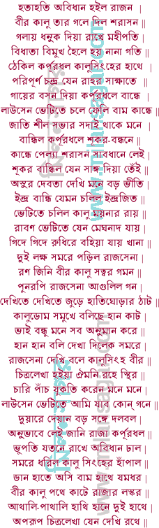 | সিফাই সহিত অশ্ব হানে এক চোটে | কৌতুকে বালক যেন ইক্ষুদন্ড কাটে || ঢালী পাকি কত পড়ে সংখ্যা নাহি তার | কালু বীর কৌতুকে বলিছে মার মার || নৌতন রাউত রাণা রণে পড়ে ঠায় | পঞ্চমীর চন্দ্র যেন গড়াগড়ি যায় || রাম রাম শবদ সমরে সভে শুনি | চৌদিগ কাঁপিল ডরে চঞ্চল অবনী || বড় গোলা দুপাশে জলদ যেন গাজে | রণমধ্যে মাতঙ্গ সমরে যেন যুঝে || দড় দড় মহাবীর হানে কাল অসি | দিনে উপনীত হৈল অন্ধকার নিশি || রাজসেনা হানে কাটে ডর ভয় নাই | রণে সখা কালুবীরের শ্রীধর্ম গোঁসাই || গড়ের দুয়ারে বীর একা রণ জোড়ে | কিবা গজ তুরকি রাউত রণে পড়ে || সিফাই সর্দার পড়ে কিবা তার কথা | ঝনঝন রণে পড়ে রাউতের মাথা || সমরে পন্ডিত কত কর্ণের সমান | রণে যুঝি পড়িল সৈয়দ খোরাশান || হাতাহাতি মহারণ গড়ের দুয়ার | রণে ভঙ্গ দিল সেনা পড়িল বিথার || অবশেষে পালায় রাজার সৈন্যগণ | কালুসিংহ বীর তবে জয় হৈল রণ || সমর জিনিঞা বীর সত্বর পয়ান | অসুর দলিয়া যেন মঘবান যান || গন্ডকীর তীরে হোথা লাউসেন রাজা | কালুর কল্যাণে সেন করে ধর্মপূজা || সেন বলে কালু না আইল এতক্ষণ | শাখা সুখা তের দলুই চায়্যা দেখে গন || কেহ বলে যুদ্ধের লক্ষণ পাই গড়ে | শুকিনি গিধিনি কত ঝাঁকে ঝাঁকে উড়ে || কেহ বলে চল যাই গড়ে দিব হানা | রাজা বলে কাঙুর ভিতরে নিব থানা || হেন বেলা আইল কালু যম অবতার | কর্পূরধল ভেট দিয়া করিল জোহার || লাউসেনে ভেট দিল কাঙুর-রাজন | জোড় হাথে বলে কালু জয় হৈল রণ || নিধন করিলু রণে পাঁচ লক্ষ বল | বান্ধিয়া আন্যাছি এই রাজা কর্পূরধল || এত শুনি হরষিত ময়নার রায় | বকশিস করিল জামা উতারিয়া গায় || আসর সহিত ধর্ম তুমি দিবে বর | দ্বিজ রূপরাম গান শ্রীরামপুরে ঘর || দারুণ বন্ধনে তবে কর্পূরধল রায় | নিবেদন করে কিছু লাউসেনের পায় || শুন রাজা লাউসেন মোর নিবেদন | অবিলম্বে দূর কর কঠিন বন্ধন || দারুণ বন্ধনে প্রাণ হয়্যাছে কাতর | বার বত্সরের দিব কাঙুরের কর || কর দিব বেবাক কলিঙ্গা দিব দান | দশ গুণে রূপবতী শচীর সমান || হেন কন্যাদান দিব শুন মহাশয় | ধর্মকথা নিবেদিল অন্যমত নয় || দুঃখী দেখি লাউসেন অমনি দিল সায় | বীর কালু কর্পূরধলে বলে উভরায় || সত্য কর এখানে তুলসী গঙ্গাজল | কলিঙ্গা লাউসেনে দিব এই কথা বল || এই কথা তোমার প্রত্যয় নয় মনে | সত্য করি বল কন্যা দিব লাউসেনে || গঙ্গাজল তুলসী তুলিয়া নিল হাথে | নাম ধরি দান দিব ধর্মের পিরীতে || কালু ডোম রাজার বন্ধন দূর করে | কর্পূরধল বলিল লাউসেন বরাবরে || হেনবেলা কালুসিংহের বলে তাঁর পায় | নফরের দোষ কিছু নাঞি লবে রায় || এইরূপ রাজধর্ম সভার উপর | রাজার লবণ খাই রাজার চাখর || এত বলি তিনবার করিল জোহার | কাঙুরে বসিল লাউসেনের দরবার || . ****************** . কলিঙ্গবিভা পালার পরের পৃষ্ঠায় . . . . পাতার উপরে . . . মিলনসাগর |