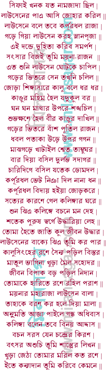 | সপিন্ড নাহিক দিলে বত্সর অশুচি | মাছি পোক ডাঁশ যেন পুতিগন্ধ রুচি || বৈদেশী রাজার পায়ে কর নিবেদন | তবে বিভা বত্সর দিবস বিলম্বন || কন্যার বচন শুনি কর্পূরধল রায় | লাউসেনের কাছে তবে ধীরে ধীরে যায় || বিশেষ বারতা বলে করি জোড়হাত | অবধানে শুন রাজা ময়নার নাথ || অনেক পড়িল রণে জ্ঞাতিবন্ধুজন | না জানি কতেক দিনে হবেক দাহন || শোকে তনু মলিন মরমে বড় শাল | জ্ঞাতির প্রধান কত মৈল মহীপাল || আর কত কত মৈল জ্ঞাতির প্রধান | সপিন্ড নইলে কেবা দেই কন্যাদান || বত্সর বিলম্ব কর ময়নার রায় | কন্যাদান দিয়া দেশে করিব বিদায় || এত যদি শুনিল ময়নার তপোধন | মনে করে কেমনে বত্সর বিলম্বন || জোড়হাথে বলে কালু এহার উপায় | হেনই দিবসে মনে কর ধর্মরায় || দ্বিজ রূপরাম গান সখা নিরঞ্জন | আলস্য তেজিয়া হরি বল বন্ধুজন || কালুর বচনে রাজা ধর্ম মনে করে | পতিত পাবন প্রভু পার কর মোরে || সমরে পড়িল সেনা যদি প্রাণ পায় | কলিযুগে তোমার খিয়াতি রহি যায় || এক মনে ধর্ম যদি কৈল সঙরণ | হেনবেলা বৈকুন্ঠে জানিলা নিরঞ্জন || আজ্ঞা দিল সহস্র লোচন মায়াধর| অমৃত বরিষ গিয়া কাঙুর-ভিতর || অনুমতি পাইল যদি দেবতার রায় | জলদ সংহতি করি কাঙুরেতে যায় || রুহিণী কুন্ডের জল নিলেক তুলিয়া | বরিষণ পীযুষ কাঙুর দেশ গিয়া || আচম্বিতে মেঘ ডাকে নাহিক সঞ্চার | ঈশানে ঊরিল করি ঈশ্বর আন্ধার || মন্দ মন্দ সঘনে অমৃত বরিষণ | অভিষেক করে যেন দেবব়্যা ব্রাহ্মণ || প্রবাল মুকুতা হীরা বরিষয়ে পাট | ছমাসের মড়া উঠে বলে হান কাট || গায়ে জামাজোড়া উঠে সিফাই সর্দার | মৃত সেনা প্রাণ পাইল বলে মার মার || রণভেরী দুন্দুভি চৌদিকে বাদ্য বাজে | ঢালী উঠে ফলঙ্গ সারিয়া ঘন গাজে || কত কত হাথি ঘোড়া পাইল জীবন | সুধা পারশনে হৈল নৌতন চেতন || যার চক্ষু খায়্যাছিল গিধিনি শুকিনি | সুধা পরশনে তার নৌতন লোচনি || যত সেনা মব়্যাছিল পাইল প্রাণদান | সবিস্ময় সকল সংসার হৈল আন || উঠিল কুঞ্জর ঘটা যেন কাদম্বিনী | বিনা মেঘে শস্য যেন পুরিল অবনী || দুবরাজ প্রাণ পাইল নরসিংহ রায় | ঐ কালু বলি কেহ উঠিয়া পালায় || লাউসেন নাম বলি সর্বজন কয় | কেহ বলে অবতার জানিল নিশ্চয় || কেহ বলে এমন সপনে দেখি নাঞি | রামরূপ অবতার যেমন গোসাঞি || কর্পূরধল রাজা বলে আমি ভাগ্যবান | এই দন্ডে লাউসেনে দিব কন্যাদান || বড় সুখ সম্পদ সভার ঘরে ঘরে | আনন্দের সীমা নাই কাঙুর নগরে || রাজার মহলে বাজে ব্যালিশ বাজনা | কত কত দেশে দেশে উঠিল ঘোষণা || ধাওাধাই লোক যত আনে আয়োজন | কলিঙ্গার অধিবাস করে শুভক্ষণ || প্রতিহার আইল পন্ডিত পুরোহিত | নিবেদিল যত কিছু বেদের বিহিত || শুভক্ষণে কন্যার করিল অধিবাস | দ্বিজ রূপরাম গান অনাদ্যের দাস || . ****************** . কলিঙ্গবিভা পালার পরের পৃষ্ঠায় . . . . পাতার উপরে . . . মিলনসাগর |