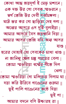 ঘোর ভীমা ভয়ঙ্করী বিশ্বরূপা খড্গেশ্বরী দুর্গতিনাশিনী হর-জায়া | তেজিয়ে হরের ঘর ঘটেতে করহ ভর দেহ দুর্গা চরণের ছায়া || ভার-অবতারের হরি তেজিয়ে বৈকুন্ঠপুরী জন্ম লৈল দৈবকী-জঠরে | তার পক্ষে-বল হয়্যা শিবারুপী মহামায়া পার কৈলে যমুনার নীরে || যবে হৈল মন্বন্তর দেবতার হৈল ডর বলবান হইল অসুর | শিবশক্তি নারায়ণী সকল পুরাণে শুনি তাহারে বধিয়া কৈলে চুর || রক্তবীজ মহিষাসুর সময়ে করিলে চুর হুহুঙ্কারে ধুম্রলোচন | চন্ড মুন্ড আদি বীর কেহ নহে রণে স্থির একে একে করিলে নিধন || নানা বর্ণের বাদ্য বাজে অষ্ট নায়িকা সাজে ব্রহ্মাণী রুদ্রাণী কপালিনী | শুম্ভ নিশুম্ভ রণে বধিলে অসুরগণে তুমি জয়া দনুজদলনী || ইতিহাস রামায়ণে যবে রাম গেল বনে সীতা চুরি করিল রাবণ | রঘুনাথ জোড়-হাথে সেবিল সমর-পথে তবে রাবণ সবংশে নিধন || করজোড়ে করি স্তুতি বন্দো মাতা ভগবতী পূর্ণ কর নায়কের বাসনা | ধর্ম্মের আদেশ পান দ্বিজ রূপরাম গান যারে হৈল দৈবের ঘটনা || |