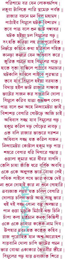 | পথমধ্যে বেগারি পদাতি কত ধরে | আনন্দে চলিল ভাট সিমুল্যা শহরে || পাছু করে গোউড় আরতি কাশীপুর | বঙ্গভাটি মাজন রহিয়া গেল দূর || দক্ষিণে দোরনি উজা পদ্মাবতীর ধার | কৌশিক কনক পার রহিল বেহার || বচনে বিলম্ব নাঞি বিষম আরতি | রহিল গোলোকপুর বনজ বসতি || এক আঁঠু পার হৈল বিমলার জল | দক্ষিণে দারুণ দহ আগম অতল || সিমুলের গড় পাইল দ্বিতীয় প্রহর | বার দিয়া বস্যাছে হরিপালকুঙর || চারিদিগে প্রজা বৈসে প্রধান মন্ডল | কুলীন পন্ডিত রাজা কবি নিরমল || হেনবেলা ভাট গিয়া দিল দরশন | বোঝা ভার চারিদিগে অশেষ যতন || পড়িল পিঙ্গল ছন্দ ভাট গঙ্গাধর | বসিতে আসন দিল দরবার ভিতর || পরিহাস বচন বলিল মহারাজ | বেগারি রাখিল যত অধিবাস সাজ || ভাট গঙ্গাধরে রাজা করে নিবেদন | নিশ্চয় বলিবে ভাই নিজ প্রয়োজন || কিমর্থ কারণে আইলে আমার নিবাস | কার দ্রব্য এত দেখি অবনী প্রকাশ || ভাট গঙ্গাধর বলে শুন সত্যবাণী | গৌড়েশ্বর মহারাজা পাঠাল্য আপনি || তোণার দুহিতা নাম কানড়া কুমারী | তারে বিভা করিব গোউড় অধিকারী || এখনি দেখিবে রাজা হাতে সূতা বর | আমার বচনে তার অধিবাস কর || রাজাকে অধিক হৈলে রাজ্যের ঠাকুর | দরবারে গৌরব গুরু রাজার শ্বশুর || অবিলম্বে রাজারে কানড়া কর দান | বারভূঞাগণ মাঝে তোমার বাখান || মূর্তিমান দেখ সঙ্গে রাজ-পুরোহিত | অধিবাস দ্রব্য লহ বেদের বিহিত || বারতা পাইয়া রাজা বলে জোড়কর | বড় ভাগ্য আপনি জামাতা গৌড়েশ্বর || দুই দন্ডে করিব কন্যার অধিবাস | এত দিনে সফল মনের অভিলাষ || এত শুনি হরিপাল হরষিত মন | সমাদরে দিল ভাটে বসিতে আসন || গোউড়ের বেগারিকে করিল গৌরব | একে একে বসিতে আসন দিল সব || তবে রাজা বিদায় ভাটের বরাবর | হরিপাল কুঙর গেল কানাড়ার ঘর || অবধানে বস্যাছে ধুমসী বলধর | যমের সমান দাসী হাথে যমঘর || শশিমুখী কানড়া রতন সিংহাসনে | একভাবে ভবানী পূজেন রাত্রিদিনে || কানড়া কন্যার কাছে দরশন দিল | জনকের কাছে যেন জানকী সাজিল || পিতার চরণে কত করে দন্ডবত | রাজা বলে এতদিনে সিদ্ধ মনোরথ || তুমি ভাগ্যবতী বড় জগত বাখানি | তুমি হৈলে গোউড়ে রাজার পাটরাণী || ভবানী পূজিলে তুমি এ বার বত্সর | বড় ভাগ্যে পতি পাইলে রাজা গৌড়েশ্বর || তুমি কন্যা হৈতে ভাল হৈল নামযশ | রূপ গুণ শুনিয়া ভূপতি হৈল বশ || আজ্ঞা পাইলে অধিবাসে আমি দিব মন | কালি ভানুমতী তোর করিব সেবন || হাথে সূতা বান্ধা রাজা আসিব এখনি | উভদলে আসিব ছাইয়া দিনমণি || রাজা গৌড়েশ্বর তুমি কর স্বয়ম্বর | অবধানে রাখ ঝিএ আমার উত্তর || এত শুনি কানড়া মরমে পাইল লাজ | মহীলতা হইল পঞ্চমী দ্বিজরাজ || . ****************** . লৌহগণ্ডার পালার পরের পৃষ্ঠায় . . . . পাতার উপরে . . . মিলনসাগর |