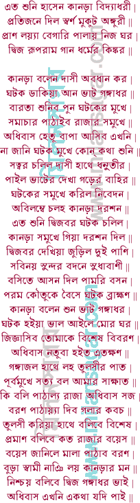 | এত শুনি ভাট বলে কানড়া সাক্ষাতে | বিফল বচন বলে গঙ্গাজল হাথে || শুন গো কানড়া তুমি বড় ভাগ্যবতী | গোউড় ভুপাল ধনি হব তোর পতি || মহা গুণবান রাজা পরম সুন্দর | রাজার বয়স বটে বাইশ বত্সর || কুবের সমান ধনী কুলীন পন্ডিত | গায়ের বরণ চাঁপা মদন মোহিত || মিছা নিবেদিল ভাট হাথে গঙ্গাজল | কুমারী কানড়া হৈল জ্বলন্ত আনল || বলিতে লাগিল কন্যা আগুনের ধার | এই মহাপাতকে কেমনে হবে পার || বুড়া রাজা গৌড়েশ্বর বর হৈতে চায় | এত যদি বয়সে এমন সাধ যায় || বলিতে বলিতে কোপ অতিশয় বাড়ে | ঘটক ব্রাহ্মণ বান্ধ ঘোড়ার পিছাড়ে || শুন গো ধুমসী দাসী শুন মোর কথা | গঙ্গাধর ভাটের মুড়াহ নিঞা মাথা || ভাল মানি ভাটকে দেশের বাহির কর | এত শুনি ধুমসী ধরিল গঙ্গাধর || জামাজোড়া কাড়্যা নিল ছুরি যমঘর | নাপিত আনিঞা মাথা মুড়াল্য সত্বর || বসিল নাপিত কাছে হাথে লয়্যা খুর | দেখিয়া ভাটের প্রাণ করে দুরদুর || গাধা খচরের মুতে ভিজাইল চুল | ভাট বলে ভাত খাব করিয়া বেরুল || আগু টানে ধুমসী গলায় দিয়া দড়ি | পাছু হৈতে বাইতি মারিছে ঢাকের বাড়ী || অপমান করে তার নগর চাতরে | সিমুলের রাজা কিছু বলিতে না পারে || ওড়মালা গলায় দিলেক মালাকার | উঠিতে বসিতে বাড়ি ইড়িক পরাজয় || ভাট গঙ্গাধর কান্দে মাথে হাত দিয়া | সিমুলে আইল কেন ঘটক হইয়া || ধুমসী ধরিয়া তারে দেশ বই করে | বলিতে লাগিল কিছু তার বরাবরে || ধাওধাই গৌড়ের রাজাকে গিয়া বল | একবার দেখা দেই নিজের দলবল || পড়িলে উঠিতে নারে ভাট গঙ্গাধর | উভরড়ে ধাওধাই গোউড় শহর || গোউড় শহর ভাট ধাওাধাই যায় | পড়িলে উঠিতে নারে ফিব়্যা নাহি চায় || উভরড়ে ধাওাধাই গোউড় শহর | গোউর শহর ভাট ধাওাধাই যায় || পড়িলে উঠিতে নারে ফিব়্যা নাহি চায় | ত্বরাতরি চলে ভাট ধরিয়া পরাণ || গোউড় শহর গিয়া পাইল নিদান | কত দূরে মহাপাত্র দেখে মহারাজ || রাজার চরণে বলে সিদ্ধ হৈল কাজ | ঐ দেখ ঘটক আইসে ধাওধাই || রাঙা ফাগ পাইল পারা ছিটের কাবাই | কহিতে বলিতে ভাট দিল দরশন || দুহাথ মাথায় দিয়া জুড়িল রোদন | দশমুখ হৈলে কই কানড়ার কথা || তোর নাম করি মোর মুড়াইল মাথা | কোন ছার গৌড়েশ্বর মোর যোগ্য বর || পাঁচমুখে গালাগালি দিলেক বিস্তর || আনের আরতি হৈলে নানা ধন পাই | তোমার আরতি হৈলে লাথি চড় খাই || এত শুনি ভুপতি করিল হেঁটমাথা | ভাগ্যে না বান্দিলু হাথে অধিবাস সূতা || পাত্র মহামদ ভাটে করিল আসান | বলিতে লাগিল তবে নৃপ বিদ্যামান || আমার বচন রাজা অবগতি কর | মাথায় মুকুট দিয়া হয়্যা চল বর || হরিপাল বিভা যদি নাহি দেই বেটী | হাথ দিয়া চোয়াইব সিমুদের মাটি || বলে বিভা দিব কন্যা কুমারী কানড় | উলট করিব আমি সিমুলের গড় || সাজন করিব সঙ্গে বারভূঞাগণ | বলে ছলে বিভা দিব করিয়া যতন || এই দন্ডে অধিবাস কর গিয়া রায় | মায়্যার বড়াঞী এত সহা নাই যায় || এত শুনি বলিল ভূপতি গৌড়েশ্বর | অধিবাস করে রাজা দরবার ভিতর || সুবেশ করিল আভা আনিঞা ন