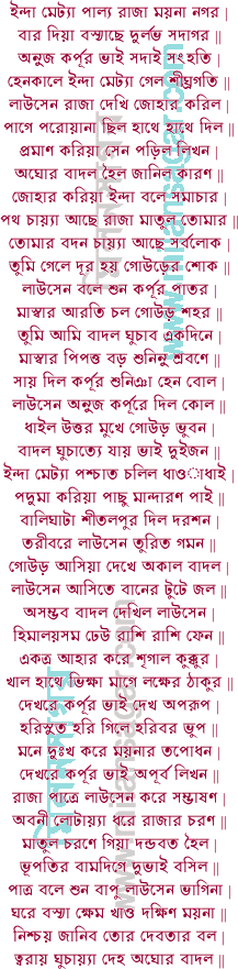 | সকল সংসার বলে লাউসেন ধর্ম | এবার জানিব আমি ভাগিনার মর্ম || তবে যদি অঘোর বাদল ভাঙ্গে নাঞি | বাসুলি পূজিব তোরে যে করে গোসাঞি || রাজা বলে লাউসেন ধর্মে দেহ মন | কলি অবতার তুমি পতিতপাবন || ধর্মপূজা হেতু বাপু হৈল সর্বনাশ | অনেক দিবস নাঞি রবির প্রকাশ || তুমি আজি সংসারে জীবন ধন বাপ | দূর কর আপনি লোকের পরিতাপ || ভালমত আপনি মানাবে ধর্মরাজা | আমার বদলে তুমি কর ধর্মূজা || রাজার বিনয়বাণী হেঁটমাথে নিল | প্রভুর গাজন ঘরে দরশন দিল || বিধিমতে আছিল বাইতি হরিহর | ভাই ভাই বলিয়া লাউসেন জোড়কর || অঙ্গহীন পূজা দিল গৌড়ের ভূপতি | তোমা হেতু পরিপূর্ণ হব বারমতি || এত বলি ধর্ম পূজে সদা শুচি মন | কর্পূর পাতর আনি দিল আয়োজন || সাধিল অনাদ্য পূজা দিয়া পুষ্পজল | আপনি ভাঙ্গিয়া গেল অঘোর বাদল || ঝড় বৃষ্টি দূর হৈল রবির প্রকাশ | গোউড়ের লোক যত হইল উল্লাস || দূর হৈল অকাল ধর্মের বাজিখেলা | তরণি প্রকাশ পাইল দ্বিপ্রহর বেলা || দরবার করিয়া বৈসে রাজা গৌড়েশ্বর | বারভূঞা বসিল সমুখে মন্ত্রিবর || রাজার দরবারে আসি বৈসে দুই ভাই | কেহ অনুমান করে কানাই বলাই || বারভূঞা ভূপাল লাউসেন মুখ চায়| দরবারে বসিয়া কেহ হরিগুণ গায় || লাউসেন জীবন দিল বলে সর্বজন | দুই ভাএ নরপতি দিল অভরণ || কস্তুরী চন্দন দিল পারিজাত মালা | রূপের প্রতাপে হৈল রাজসভা আলা || পাত্র বলে মোর মুন্ডে পড়িল বজ্জর | রাজভূষা পাইয়া দুভাই যায় ঘর || কোন রূপে রঞ্জাকে করিব আঁটকুড়ি | কতদিনে পেলাইব ময়নার হাঁড়ি || পশ্চিম উদয় হেতু দিব পাঠাইয়া | সেখানে মরিব বেটা নব খন্ড হয়্যা || নিবেদন করে পাত্র রাজার চরণে | কি কারণে ভাল ভাল বল লাউসেনে || শনিবারে বাদল ভাঙ্গিল শনিবারে | তাড় বালা তবে কেন লাউসেনকুমারে || মন দিয়া শুন রাজা পূর্ণ সমাচার | তোমা লঞা বিপাক পড়িল আর বার || অঙ্গহীন গোউড়ে ধর্মের পূজা দিলে | দাদুর ঘাটার দিন পাটা খসাইলে || পূর্ণ পূজা না পাইল ব্রহ্ম সনাতন | অকার্য হইল বড় আমিষা ভোজন || সবংশে হইব রাজা ধবল পাখর | এত দূর রাজতি তোমার নৃপবর || এত শুনি রাজার বদনে বাক্য নাহি | উপদেশ ইহার পাইব কার ঠাঞি || পাত্র বলে শুনহ নৃপতি মহাশয় | বার দন্ডে যদি দেখ পশ্চিম উদয় || হাকন্ড উদয় সেই যদি দেখ রায় | তবে এই আপদ বালাই দূরে যায় || ধর্মপদ কোকনদ মত্ত মধুব্রতী | দ্বিজ রূপরাম গান ব্রহ্ম যুগপতি || একথা শুনিঞা রাজা মনে সবিস্ময় | কোন দেশে কেবা দিব পশ্চিম উদয় || উপদেশ ইহার বলিবে বর্তমান | পাত্র বলে মহারাজ কর অবধান || পূরবের রাউল পশ্চিমে অস্ত যায় | পশ্চিমের উদয়ে অনাদ্য পূজা পায় || কে যাবে উদয় দিতে বল নৃপবর | তার বাক্য বল তুমি দরবার ভিতর || পাত্র বলে যেজন মাহিনা বস্যা খায় | সেজন থাকিতে বল অন্য কেবা যায় || বোলে চালে যেবা পরে বস্ত্র অলঙ্কার | যেজন বড়াঞি করে বসিয়া দরবার || পশ্চিম উদয় দিতে সে করু পয়ান | লাউসেন বিদায় কর হাথে দিয়া পান || পাত্রের ব