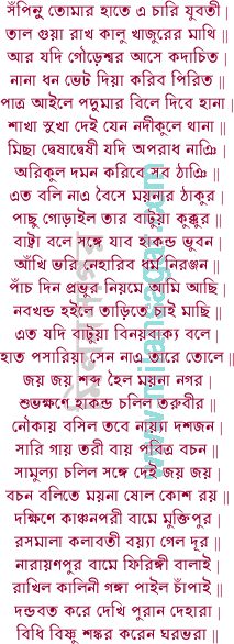 | সামুল্যা বলেন বাপু শুন মন দিয়া | এখানে মরিল বনি তোমার লাগিয়া || শালে ভর দিতে বনি হৈল খানি খানি | পিতামহ সংহতি দেখিল চক্রপাণি || রন্ধন ভোজন কোথা চিড়া খন্ড খায় | রাজপুর রাখিয়া হার্মাদপুর পায় || দুই কুলে অনেক দেখিল অবতার | বাঘ মষি ভল্লুক কাননে একাকার || ছাড়িল বিজয়পুর হার্মাদের থানা | পক্ষের তরাসে রাজা বাজায় বাজনা || কামান গরজে মেঘ উত্কল বন্দুক | সাবধানে তরী বায় হইয়া ভুবুক || দারুণ জলের ঢেউ মলয় পর্বত | দিশারু মানুষ খাত্যে দিশা করে পথ || তিন দিন নাবিক কালিনী গঙ্গা বায় | সমুখে বিক্রমপুর দারকেশ্বর পায় || কৌতুকে চলিল বাহি নদী দারকেশ্বর | সমুখে কামালপুর রাখিল নিয়ড় || ঝোর ঝোর খানা কত থাকে ডানি বামে | ধর্মদহ নাবিক বাহিল তিন যামে || হাথে প্রাণ করিয়া বাহিল পীরদহ | এক দন্ড লাউসেন নাহি বলে রহ || ঝারখন্ড সমুখে বাহিল হীরাপাড়া | তরীবর চলিতে সঘনে শিঙ্গা কাড়া || ডাহিনে মনসাবাটী পীরের মোকাম | দয়াপুরে দেউলে দেখিল সীতারাম || আতাপুর দেউলে দেখিল দশভুজা | হনুমানদহে তবে দিল আদ্যপূজা || রাখিল তরণী গুহা সরণি সঞ্জম | বার দন্ডে পাইল রাজা সাগর সঙ্গম || সমুখে হারাল্য দিশা নাঞি দেখে কুল | দন্ডবত হৈল দহে দেখিয়া দেউল || সাগর সঙ্গমে সভে কৈল স্নানদান | সামুল্যা আমিনি কিছু বলে বিদ্যমান || কোন মহাতীর্থ এই কহিবে কথন | দব়্যায় দেউল বাছা দিল কোন জন || রাজা বলে মাসী গো বিলম্ব নাঞি সয় | পশ্চাত ইহার কথা কহিব নিশ্চয় || দিবানিশি জীবন জননীহেতু কান্দে | জনক রাখিয়া বন্দী কেবা বুক বান্ধে || পশ্চিম উদয় হৈলে পড়ি রামায়ণ | সগর ভূপতি ছিল অতি বিচক্ষণ || দশ মুখে মহিমা বলিতে নারি তার | ব্রহ্মশাপে মৈল ষাটি সহস্র কুমার || আগে পূজা দিব গিয়া হাকন্ড ভিতর | বলিব এ সব কথা যবে যাব ঘর || এত বলি আনন্দে চলিল তপোধন | অবিলম্বে হিজলী বন্দর দরশন || ডাহিনে মনোজপুর বামে সপ্তগ্রাম | দেখিয়া ত্রিবেণী ধারা করিল প্রণাম || দিবানিশি চলে ময়নার অধিকারী | ধর্মজয় ভকিতা বলিছে হরি হরি || আশে পাশে গ্রাম যত কত লব নাম | আম্বুয়া শহর পাল্য বেলি দুই যাম || এই ত গঙ্গার কুলে দিল দরশন | হবিষ্য করিতে হবে শাস্ত্রের লিখন || গঙ্গাজলে হবিষ্য করিলে ভাল হয় | দশ দিন উপবাসী রঞ্জার তনয় || মলিন হয়্যাছে মুখ মনে লাগে ব্যথা | হবিষ্য করহ বাপু না কর অন্যথা || গঙ্গাজলে হবিষ্য উচিত বড় হয় | এত শুনি লাউসেন রাম রাম কয় || আমিষ্য গঙ্গার জল গরুড় পুরাণে | ইহাতে হবিষ্য আমি করিব কেমনে || . ****************** . অঘোরবাদল পালার পরের পৃষ্ঠায় . . . . পাতার উপরে . . . মিলনসাগর |