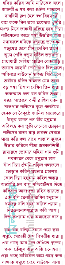 | আশদের গাছে বেল জাম গাছে তাল | দেশের যেমন আভা আছে সর্বকাল || চাঁপা গাছে ওড় ফুল সূর্যের উদয় | সামুল্যা মাসীকে তবে লাউসেন কয় || কেমন দেশের কথা কহ আগো মাসী | কতদিনে হব গিয়া হাকন্ড নিবাসী || দেখিয়া দেশের আভা প্রাণ উড়্যা যায় | মা বাপ রহিল বন্দী না দেখি উপায় || এত শুনি সামুল্যা আমিনি কিছু বলে | স্নান পূজা কর গিয়া হাকন্ডের জলে || হাকন্ড নিকট বটে আমি ভাল জানি | সেইখানে দেখিবে ঠাকুর চক্রপাণি || তুমি মোর জীবনমরাল বাপধন | একমনে দড়াইবে ধর্ম নিরঞ্জন || সাহস করিলে হয় সর্বঠাঞি জয় | অবশ্য হইব বাছা পশ্চিম উদয় || শালে ভর দিল বনি তোমার কারণ | দুই পর নৌকা বাহ পশ্চিমের গন || ডাহিনে অকুল নদী সেতুবন্ধ জল | নৌকা ঠাট লঞা বাপু যায় রসাতল || শার্দূল কুরঙ্গ জয় খায় এক ঘাটে | ডাক শুনি বিষম তামার হাঁড়ি ফাটে || নকুল ভুজঙ্গ বস্যা একুঠাঞি আছে | লাউসেন শুধাইল সামুল্যার কাছে || সামুল্যা বলেন বাছা মনঃকথা নাঞি | সমুখে হাকন্ড বটে যে করে গোসাঞি || সমুখে গম্ভীর নাদে বহিছে ত্রিধারা | দরিয়ার মধ্যে দেখ ধর্মের দেহারা || মুনি সব তপস্যা করয়ে অতি দড় | মকর কুম্ভীর ফিরে তমু নাঞি ডর || পশ্চিম দেশের ভাষা শুনি বিপরীত | কর্মনাশা বামভাগে বহিল তুরিত || পীরের দরগা দেখে মক্কার নিশান | বামদিগে হজরত রাখে বিদ্যমান || আশে পাশে বান্ধা পথ রায়টি পাথরে | তিমির সমান সব দেখ্যা যায় দূরে || ধর্মদহ পার হৈতে বিলম্ব না সয় | হাকন্ডের তীরে তরী চলিল নিশ্চয় || তরণীর পাশে পাশে ভাসে তিমিঙ্গিল | অনেক দিবসে হৈল হাকন্ড দাখিল || অস্তগিরি হাকন্ড হইল দরশন | দেখিল নদীর জল লোহিত বরণ || ধর্মজয় বলি উঠে ভকিতা সকল | হাকন্ড ভুবন পাইল তরণী চপল || সামুল্যা বলেন বাপু শুন মন দিয়া | হাকন্ড ভুবন সভে উত্তরিল সিয়া || পূরবে হাকন্ড ছিল বৈকুন্ঠ ভুবন | এখন হয়্যাছে শুধু বাঁজি বেনাবন || লাউসেন বলে শুন ইছারাণা ভাই | বন কাট্যা দূর কর আপদ বালাই || এত শুনি ইছারাণা নিল ফুলপান | ধর্মের মঙ্গল দ্বিজ রূপরাম গান || . ****************** || অঘোরবাদল পালা সমাপ্ত || . এই পাতার উপরে . . . মিলনসাগর |