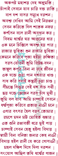 রঞ্জা দরশনে সভে জয়ধ্বনি দিল | গলায় ধর্ম্মের পাটা নাচিতে লাগিল || তপস্যার হেতু রঞ্জার বদন মলিন | আনন্দে করিল যাত্রা চাম্পাই দক্ষিণ || সন্ন্যাসী মালিনী সঙ্গে সামুলা আমিনী | রঞ্জার জীবন ধন খুড়তা ভগিনী || একমনে ধর্ম্মকে সদাই করে ধ্যান | দশ যুগ পূজার করিতে পারে ক্ষেণ || সঙ্গের প্রধান মালী আর কর্ম্মকার | পরিণামে বাণের পাজাতে চায় ধার || দিন প্রতি মালিনী দিব বিশাশয় মালা | পুষ্প যোগাইতে চাই ধর্ম্মপূজার বেলা || ইছা-রানা হাড়ি সঙ্গে সত্য অনুবল | বন কাট্যা চাঁপায়ে করিতে চায় স্থল || সঙ্গে সুয় ভকিতা সভাই চলে সাথে | ধর্ম্মের পাদুকা রঞ্জাবতী নিল মাথে || সদুল্যা বাজায় ঢাক নামে হরিহর | বেদ পড়ে পন্ডিত করিয়া উচ্চস্বর || পূজার পদ্ধতি হাথে যান পুরোহিত | কালিনী গঙ্গার ঘাটে হইল উপনীত || জয়ধ্বনি শঙ্খধ্বনি পড়ে ঘনে ঘন | নানা ধনে ধর্ম্মতরী করিলা সাজন || বার চান্দে পরম সুন্দর রথঘর | নানা আয়োজন তোলে নৌকার উপর || পুরট-কলসে লক্ষ ভার গঙ্গাজল | পূজা শেষে ভকিতা করিতে চায় ফল || চাঁপা কলা চিনি ঘৃত আতপ তন্ডুল | গগন উপরে কত উড়িছে গহুল || পশ্চাতে তুলিল তায় নিদারুণ শাল | যাহার সদনে বৈসে বার গন্ডা ঢাল || সঙ্গে সুয় ভকিতা সভাই বৈসে নায় | হরিবোল বলিয়া কান্ডারী গীত গায় || চাপিয়া চলিল রাজ্য কালিনীর জল | দ্বিজ রূপরাম গান ধর্ম্মের মঙ্গল || ময়নার লোক কান্দে কেশ-বাস নাহি বান্ধে আট বর্ণ অঝোর নয়ান | দেখিয়া রঞ্জার মুখ সভার মরমে দুখ চাঁপাই সেবিতে চলি যান || নায়্যা সব দন্ডধারী সঘনে বাহিছে তরী চলিতে তপন তারা খসে | সন্ধ্যাকালে নিয়োজিত ধর্ম্মপূজা যথোচিত করেন ভকিতা পাঁচ রসে || ঘন পড়ে জয়কার সঞ্জয় মালিনী হার অস্ত্র দিল চরণ কমলে | হরি বল্যা তরী বায় রামের মহিমা গায় অবতার দেখিল দু-কূলে || দারুণ দারিকেশ্বর দেখি বড় লাগে ডর গায় অবতার মঙ্গলে | দরশন উড়ে প্রাণ নায়্যা সব তরী বান বিলম্ভ না করে এক তিলে || সহজে দরিয়া বাহে এক দন্ড নাঞী রহে শান্তিপুরে দিল দরশন | দেউলে দেখিল রাম সিদ্ধ-ভেটী থাকে বাম দাসপুরে দক্ষিণে গহন || কালিনী বাহিল যদি দেখি দারিকেশ্বর নদী বাম দিকে পীরের আদ্যান | সীতাপুর বামভাগে সিংহবেতা তার আগে দেউলে দেখিল ভগবান || নিকট উসতপুর দেখাদেখি অতি দূর অপরূপ দেখিল দেহারা | দক্ষিণে ফিরিঙ্গীপাড়া তার আগুয়া কেতারা বামদিকে থাকে দন্ডঝোরা || জলের তরঙ্গ দেখি জীবন বিফল দেখি কেহ বা স্মঙরে ভগবান | দক্ষিণ মলয়া ঝড়ে তরী উপাড়িয়া পাড়ে নাইক হইল সাবধান || বাহ বাহ বলি ডাকে শব্দ-----নদী হাকে ( ? ) সঘনে বাহিছে কেরয়াল | অদ্ভুত মুনিচয় ( ? ) নদী জুড়ে ফেনা বয় ভাসে কত হাঙ্গর হয়াল || চঞ্চল চপট... ডরে [ যেন ] তারা খসে কিবা সম মলয়-পবন | সভে বলে হরি হরি আপুনি চলিলা তরী এক দন্ড নাঞী বিলম্বন || জাজপাড়া খানসুতি যেখানে সঞ্জয়-মতি রাখিলা বিমলা বিন্নবাটী | কুলকুল ডাকে জল দে