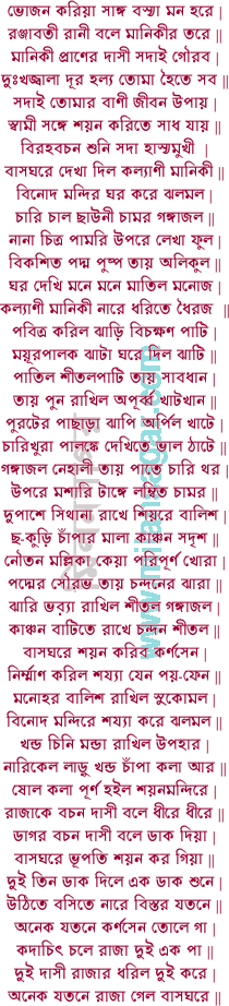 | চলিতে না পারে রাজা কাঁপে থর থর | শয়ন করিল গিয়া খট্টার উপর || [ মনে বড় সুখ পাইল মল্লিকা কুসুম | শয়ন করিতে বুড়া রাজা গেল ঘুম || ঐরূপে নিদ্রাগত নাই পাই সাড়া | গঙ্গাজলে ভাসে যেন দু মাসের মড়া || বাসঘরে শয়ন করিল নরপতি | নাস বেশ করে [ হেথা ] রঞ্জা রূপবতী || [ শ্রীধর্ম্মের মায়া কহনে নাঞী যায় | অনাদিমঙ্গল দ্বিজ রূপরাম গায় || ] বয়স-গৌরবে রসে নানা পরিপাটি | সমুখে যোগায় দাসী সিন্দুরের বাটি || নারায়ণতৈল চুয়া চন্দন লেপনি | অলঙ্কার পরিল গলায় গরুড়মণি || নাসবেশ করে রানী রঞ্জা বিদ্যাধরী | হীরামন মতি দিয়া দিব্য শোভা করি || পুরটের থোপা দিয়া বান্ধিল সুন্দর | দুসতি চাঁপার মালা তাহার উপর || মদনমোহন তায় মল্লিকার ঝারা | সিঁথীর সিন্দুর জবা দক্ষিণেতে বারা || চন্দনের রেখা দিল সিন্দুরের কোলে | উদয়পতঙ্গ শশী এক ঠাঞী জ্বলে || মোহন কাজল দিল চন্দনের ফোটা | গগনে ঈষৎ যেন কাদম্বিনী ঘটা || নয়ানে পরে রানী মোহন-কাজল | চিনি-চিনি করে যেন সাপের গরল || আনন্দে পরেন রানী অষ্ট অভরণ | সিন্দুরে মাজিয়ে রানী দেখিল দর্পণ || পরিপূর্ণ মাল্য পরে আর রসকাটি | পয়োধর-হার সাজে বড় পরিপাটি || বাসঘরে অভিলাষে নাসবেশ করে | আনন্দহৃদয় নানা অলঙ্কার পরে || বদনসৌরভে অলি পায় পদ্মগন্ধ | তাড়ের উপরে দিল জোড়া বাহুবন্ধ || শঙ্খের উপরে দিল সুবর্ণের চুড়ি | কড়েতে অমূল্য ঝাপা ভালে ভঙ্গ ঢেড়ি || যতনে পরিল রানী কনক-অঙ্গুরী | সদাই সঞ্চরে তায় তরণি বিজরী || পায়ে শোভে পাশুলী অপূর্ব্ব পাতামল | রসাল নূপুরবাজে সহজে উজ্জ্বল || লক্ষ টাকার কাঁচুলি করিল পরিধান | বিচিত্র লিখিল তায় ভারত-পুরাণ || [ বসুদেব বন্দিখানা কংস-কারাগারে | চরণে ডাড়ুকা দড় কপাট দুয়ারে || বন্দিখানা দুসর দৈবকী ঠাকুরাণী | বন্দিঘরে জন্ম নিল দেব চক্রপাণি || চতুর্ভুজ অবতার বনমালা গলে | বিপাকে দেখিয়া কৃষ্ণ বসুদেবে বলে || এই দন্ডে নন্দের মন্দিরে মোরে নেও | যশোদার কন্যা লইয়া কংসঘরে দেও || কহিতে বলিতে কৃষ্ণ বালকমূরতি | বসুদেব গোকুলে চলিলা রাতারাতি || সূর্য্যের নন্দিনী পথে আকুল যমুনা | সেই পথে সারথি হইল ত্রিলোচনা || সেই পথ জলে একা বসুদেব যান | কোলেতে আছিলা কৃষ্ণ পড়িলা নিদান || হায় হায় করে দ্বিজ না দেখে নন্দন | পুনরপি দেখা দিল দেব নারায়ণ || তবে দ্বিজ নন্দের মন্দিরে দরশন | এই সব কাঁচলিতে ভারত লিখন || কৃষ্ণ রাখি কন্যা লইয়া করিল গমন | দৈবকীরে কন্যা লইয়া দিলেক তখন || কোলে দিতে কান্দে দুর্গা কৃষ্ণের ভগিনী | প্রহরী দুয়ারে জাগে অপরূপ শুনি || বারতা পাইতে কংস আল্য কারাগারে | দৈবকীর কন্যা নিল পাবক-সঞ্চারে || পাথরে আছাড় মারে দয়া নাই মনে | হাতে হৈতে জয়দুর্গা উঠিলা গগনে || গগনে উড়িয়া দেবী ডাক দিয়া বলে | জন্মিল তোমার অরি নন্দের গোকুলে || এত বলি ভবানী হইল অন্তর্ধান | রূপরাম ফকির ধর্ম্মের গীত গান || . লাউসেন-জন্ম পালার পরের পৃষ্ঠায