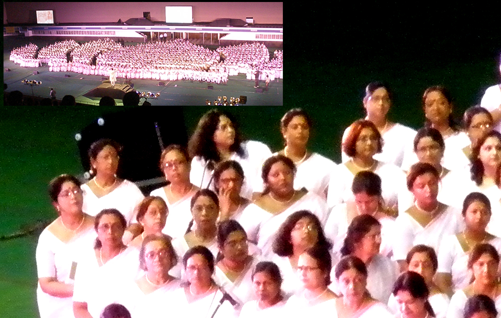 | ছবির পেছনের ডানদিকে সাগরিকা, ২০১১ সালে কলকাতার ইনডোর স্টেডিয়ামে অনুষ্ঠিত রবীন্দ্রসঙ্গীতের হাজার কণ্ঠে। ইনসেটে পুরো অনুষ্ঠানটির ছবি। সামনে গুরু সুমিত্রা চট্টোপাধ্যায়। |