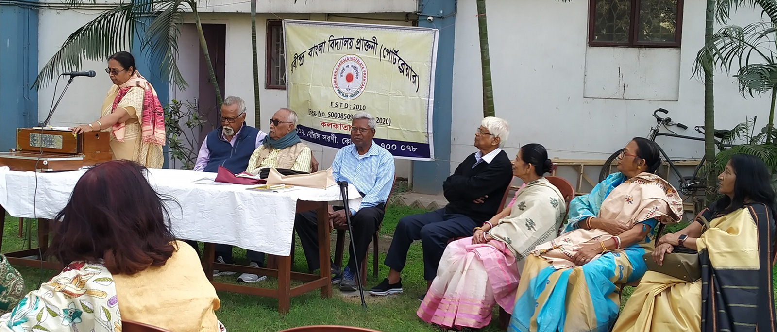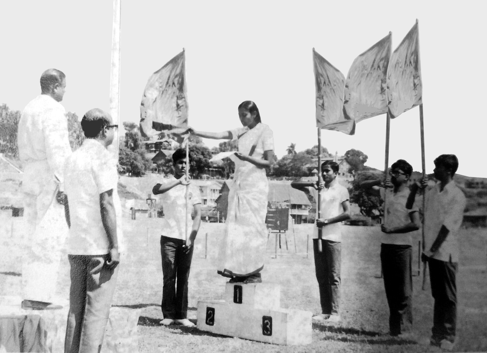 | পোর্ট ব্লেয়ারের জিমখানা গ্রাউণ্ডে, রবীন্দ্র বাংলা বিদ্যালয়ের বার্ষিক ক্রীড়া প্রতিযোগিতা অনুষ্ঠানে, স্কুল ক্যাপ্টেন সাগরিকার শপথ গ্রহনের মুহূর্ত, জানুয়ারী, ১৯৭৫। সামনে প্রিন্সিপাল শ্রী নির্মলেন্দু দাস (কালো চশমা পড়ে) |