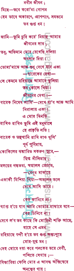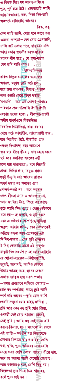 হে প্রকৃতি, নিশিদিন নব নব প্রীতি সঞ্চারিয়া শুষ্ক হিয়া ’পরে,--- কেন তুমি লুকাইছ সলাজ-অন্তরে তব গুপ্ত ধন? আমি যে লভিতে আজ এসেছি তোমারি কাছে