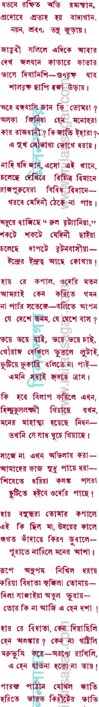 | ভারত বিলাপ কবি হেমচন্দ্র বন্দ্যোপাধ্যায় “কবিতাবলি” (১৮৭০) কাব্যগ্রন্থের কবিতা। ভানু অন্ত গেল, গোধূলি আইল ;--- রবি-কর-জাল আকাশে উঠিল মেঘ হ’তে মেঘে খেলিতে লাগিল, গগন শোভিল কিরণজালে ;--- কোথা বা সুন্দর ঘন কলেবর সিন্দুরে লেপিয়া রাখে থরেথর, কোথা ঝিকি ঝিকি হীরার ঝালর যেন বা ঝুলায় গগন ভালে। সোণার বরণ মাখিয়া কোথায় জলধর জলে --- নয়ন জুড়ায়, আবার কোথায় তুলা রাশি প্রায় শোভে রাশি রাশি মেঘের মালা। হেনকালে একা গিয়া গঙ্গাতীরে হেরি মনোহর সে তট উপরে রাজধানী এক, নব শোভা ধরে, রয়েছে কিরণে হয়ে উজলা। দ্বিতালা ত্রিতালা চৌতালা ভবন, সুন্দর সুন্দর বিচিত্র গঠন, রাজবর্ত্ম পাশে আছে সুশোভন--- গোধূলি রাগেতে রঞ্জিত কায়। অদূরে দুর্জ্জয় দুর্গ গড়খাই, প্রকাণ্ড মূরতি, জাগিছে সদাই, বিপক্ষ পশিবে হেন স্থান নাই--- চরণ প্রক্ষালি জাহ্নবী ধায়। গড়ের সমীপে আনন্দ উদ্যান, |
