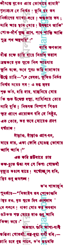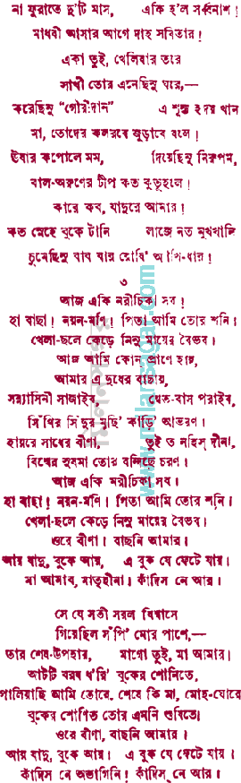 আয় বীণা, বাছনি আমার! আয় মাগো আয় বুকে, কেন দূরে ম্লান মুখে দাড়ায়ে আছিস তুই ? সহে নাত আর! তুই মোর প্রাণ জোড়া ধন, জীবনের সুখের স্বপন--- ভেঙে চূড়ে সব আজ, কে গো হানিল বাজ, সুকুমার কলি হায়, ধুলিতে লুটায়! বুঝি নারে কোন্ জন, এমন পাষাণ মন, চাঁদিমার চারু হাসি ঢাকে বদলায়! ওরে বীণা, বাছনি আমার! আয় মাগো, আয় বুকে, কেন দূরে ম্লান মুখে দাঁড়ায়ে আছিস তুই? --- সহে নাত আর!