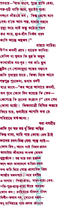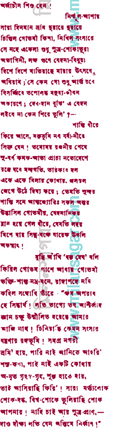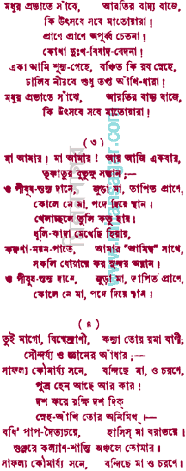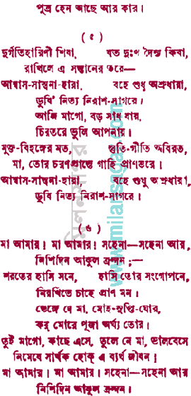 ( ১ ) শরতের শুভ্রাকাশে, স্বরগের দীপ্তি ভাসে, বিশ্ব আজি প্রসন্ন উজ্জ্বল ;--- মা আমার! মা আমার! দূরে কত র’বি আর, দীন সুতে কাঁদায়ে কেবল! কি আনন্দে পাখী গাহে গান! হর্ষোত্ফুল্ল প্রসূন-বয়ান! তটিনীর কলোচ্ছ্বাসে কি আনন্দ ভেসে আসে, স্নিগ্ধ সমীরণ কিবা পুলক-চঞ্চল! মা আমার! মা আমার! দূরে কত র’বি আর, দীন সুতে কাঁদায়ে কেবল!