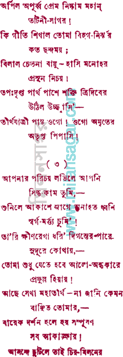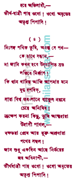 ( ১ ) তীর্থযাত্রী পান্থ ওগো! ওগো অমৃতের অতৃপ্ত পিপাসি! শুনিলে কি শুভক্ষণের আনন্দলোকের সম্মোহন বাঁশী! খুলে গেল রুদ্ধদ্বার, আঁধার গুহায় পশিল কিরণ, ছুটে এসে আলিঙ্গিল সুহৃদের প্রায় স্নিগ্ধ সমীরণ! শুনাল ললিত কণ্ঠে মধুর সঙ্গীত বিহঙ্গ সমাজ, ঘুচে গেস মুহূর্ত্তেকে কল্পনা অতীত দুঃখ-দৈন্য-লাজ! দাঁড়াইলে অকস্মাৎ নিখিল বিশ্বের মাঝখানে আসি’--- তীর্থযাত্রী পান্থ ওগো! ওগো অমৃতের অতৃপ্ত পিপাসি!