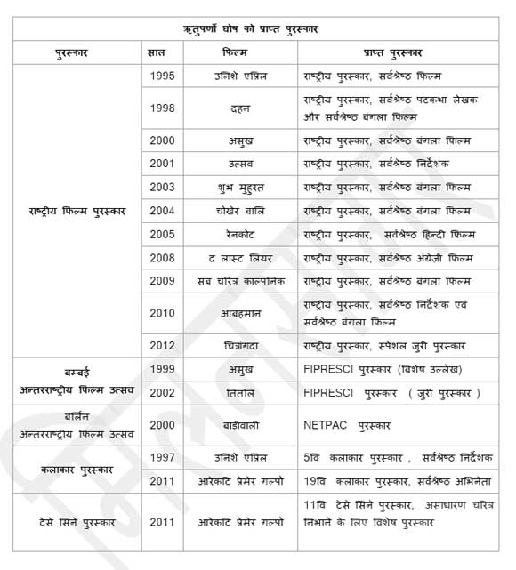 ऋतुपर्णो घोष को मिले फिल्म पुरस्कारों की सूची लंबी है। उनकी लगभग सभी फिल्मों के लिए