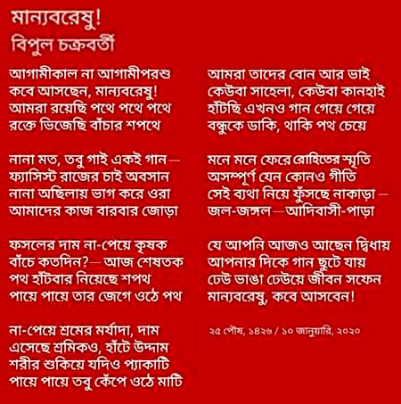 | কবি বিপুল চক্রবর্তী ইংরেজী অনুবাদ - সুমন্ত ব্যানার্জী হিন্দী অনুবাদ - কাঞ্চন কুমার মিলনসাগরে কবির পাতা ফেসবুক এখানে তোলা হয়েছে ৭.১.২০২০। কবিতাটি প্রথম প্রকাশিত হয় ১৯৮০ সালে, কবির "তোমার মারের পালা শেষ হলে" কাব্যগ্রন্থে। বিদগ্ধজনের মতে এই কবিতাটি হয়ে উঠেছিল ততকালীন বাম আন্দোলনের মূল কবিতা কণ্ঠস্বর! কবির কবিতা ও গান সম্বন্ধে জানতে, পড়তে ও শুনতে মিলনসাগরের লিঙ্কে ক্লিক করুন . . . |