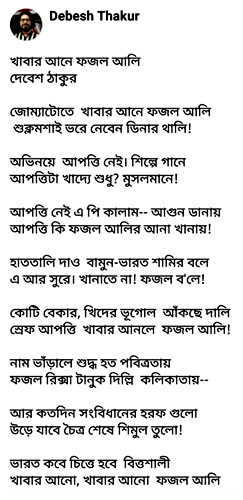 | ভিলেন কিম্বা ভ্যাম্প, আগুন কিম্বা ড্যাম্প বড়দিনে সবার হাতে হ্যারিকেনের ল্যাম্প গরীব বড়লোক, সবার ভালো হোক লাইন দিয়ে যাবে সবাই ডিটেনশন ক্যাম্প বাঙালী কাঙালী পাবে প্রীতি উপহার NRC CAA এর সঙ্গে আনবে NPR বাঙালী কাঙালী পাবে প্রীতি উপহার NRC CAA এর সঙ্গে আনবে NPR কার ধড়ে কটা প্রাণ, তাকে আটকাতে চান একই সাথে লাথি খাবে হিন্দু মুসলমান তিনি ইণ্ডিয়ান জ্যাকি চ্যান, আর তাকেই করে ধ্যান এমপি এমএলে রা ভোট দিতেই ভুলে যান যখন তখন মারবে লাথি করবে টাকা ব্যান ডিসেম্বরে স্লেজে চড়ে আসছে সুপারম্যান যখন তখন মারবে লাথি করবে টাকা ব্যান ডিসেম্বরে স্লেজে চড়ে আসছে সুপারম্যান পা গা রে সা পা, এবার গরু হবে মা জাতির নতুন জনক হবেন ক্যানাডা কুমার নিরামিশ খেলে খা, আরে নইলে ভোগে যা পালক পনির হইবে মোদের জাতীয় খাবার জিঙ্গল বেল আই টি সেল রক্ষা করে দেশ বাঙালী হলেই বুঝবে অনুপ্রবেশ জিঙ্গল বেল আই টি সেল রক্ষা করে দেশ বাঙালী দেখলেই জানবে অনুপ্রবেশ . . . |