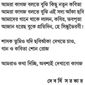 | কাগজ কবি - অংশুমান কর, আবৃত্তি - নিবেদিতা। আমার একটা কাগজ চাই। একটা অলৌকিক কাদজ। আমার একটা সাদা কালো কাগজ আছে। সে কাগজটার নাম ভোটার কার্ড। কিন্তু সেই কাগজে হবে না। আমার একটা গেরুয়া সাদা সবুজ কাগজ আছে। সে কাগজটার নাম আধার কার্ড। কিন্তু সেই কাগজেও হবে না। আমার একটা হাল্কা বেগুনী রঙের কাগজ আছে। সেই কাগজটার নাম রেশন কার্ড। সে কাগজে তো হবেই না। আমার একটাই কাগজ চাই। একটা অলৌকিক কাগজ। আমার বাবার নাম শেখ সুলেমান। বয়স আশি। আমি বাবাকে বললাম, "বাবা আমাকে কাগজ দাও"। বাবা বলল, "কাগজ বন্যা ভাসিয়ে নিয়ে গেছে, কাগজ ঝড় উড়িয়ে নিয়ে গেছে, কাগজ অনাহার খেয়ে নিয়েছে, আমার কোনও কাগজ নেই। আমার শরীরটাই এখন একটা কাগজ। আমার হাতে আর পায়ে লেখা রয়েছে আমি যা করেছি এতকাল, সেই ইতিহাস। আমার বুকের ভিতর এতদিন গোপনে লুকিয়ে ছিল যে কথা, সে কথাও আজ আর গোপন নেই। লেখা হয়ে গেছে আমার করুণ দুই চোখে। এই নাও, আমার শরীর আমি তোমাকে দিচ্ছি। তুমি ওকে বল উনি পড়ে নিন এই কাগজ।" |
