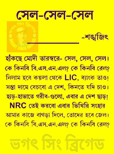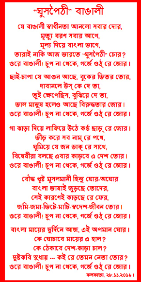 | বাঙালী তথা সারা দেশের, বিশেষ করে আদিবাসী, দলিত, মুসলমান ও পিছিয়ে থাকা মানুষের ভোটাধিকার কেড়ে নিয়ে তাদের নিকেশ করার মারণ ফাঁদ - তাই নিয়ে এই পাতার গান ও কবিতা |
