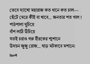 | হিঁদু পাড়ায় গুজব ছড়ায় হয়েছে মোল্লারা সব এক । মোল্লা পাড়ায় ফিসফিসানি, হল সব হিঁদুরা এক প্যাক॥ তোমার আমার সমস্যারা পড়ুক সব আজ চাপা । কে কতটা ভয়ের কারণ, সেটাই হোক আজ মাপা॥ সরকারেতে গুজব ঠেকায়, বন্ধ রেখে ইন্টার নেট । গন্ডগোলে হলে কাজ বন্ধ, গরীব কেমনে চালায় পেট ?? ছড়িয়ে গুজব নিচ্ছে মজা, যত দাঙ্গাবাজের দল । ঘুরিয়ে নজর মানুষ মেরে, যত দেশ লুটবার ছল॥ |