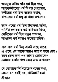 | প্রশ্ন করতে মানা কেন রাজনীতি জেলখানা॥ প্রশ্ন করতে মানা কেন ধর্ম জেলখানা॥ প্রশ্ন করতে মানা কেন জাতপাত জেলখানা॥ প্রশ্ন করতে মানা রাজা আহ্লাদে আটখানা॥ প্রশ্ন করতে মানা প্রশ্ন করতে মানা॥ |